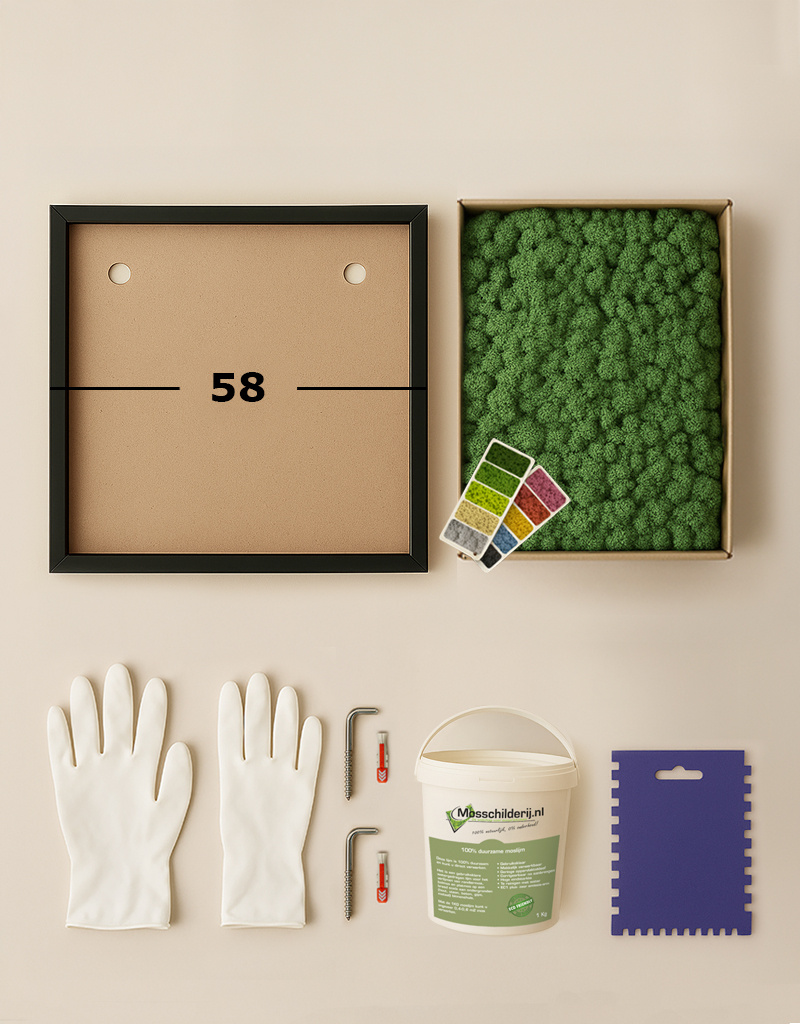 With this DIY moss kit, you can easily create your own unique and vibrant moss artwork made of reindeer moss. Choose from a variety of moss colors. The color Dimidium is shown in the photo, but of course you can select the color that perfectly matches your interior. This way, you create a truly personal piece of art that fits beautifully into your home.