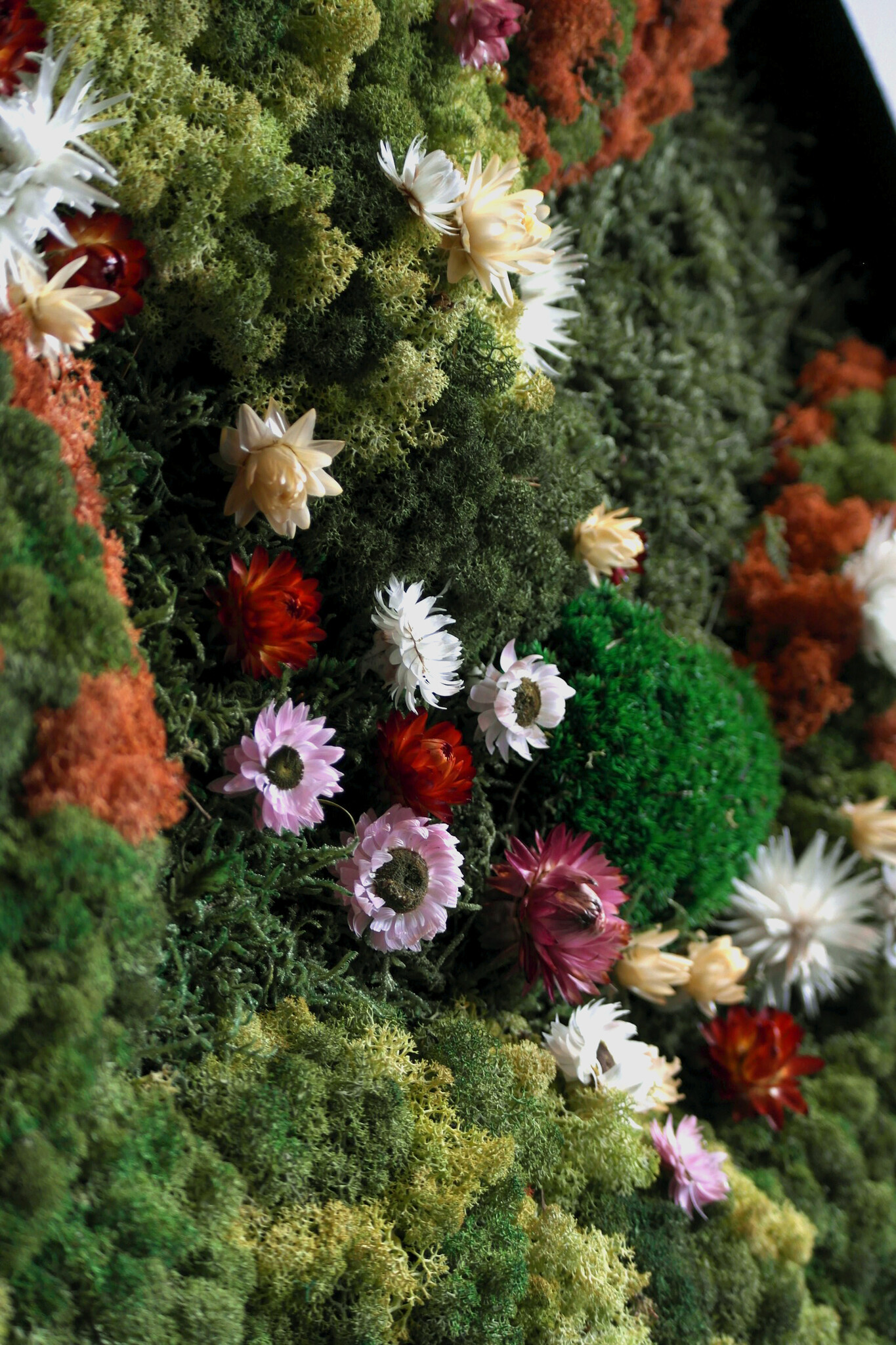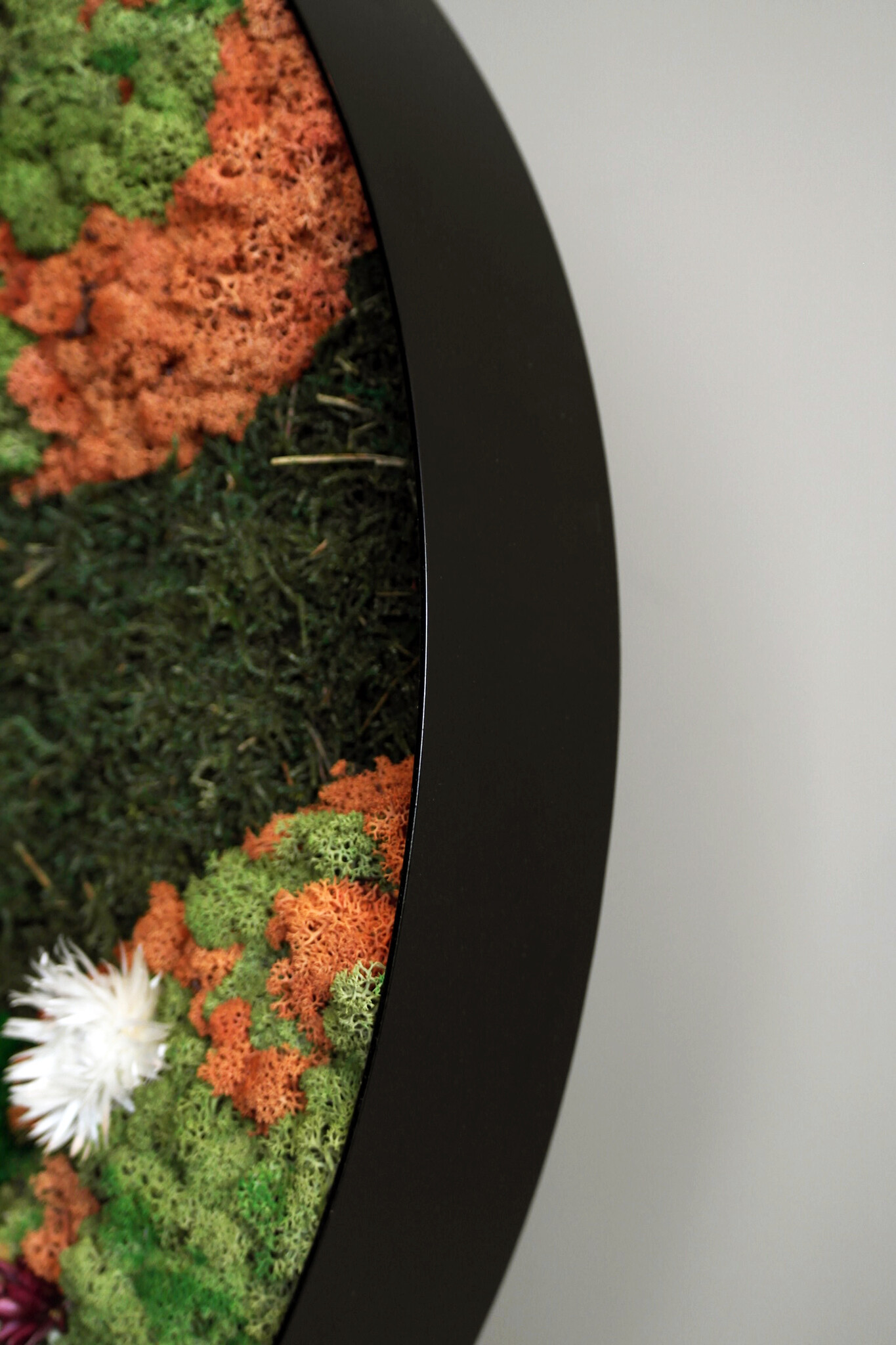 In moss artwork Avalon, various mosses are combined with cheerful, coloured dried flowers in white, orange and dark red. Perfect for those who want to give their interiors a fresh and friendly touch. Make a statement with this moss artwork and add something unique to your wall.