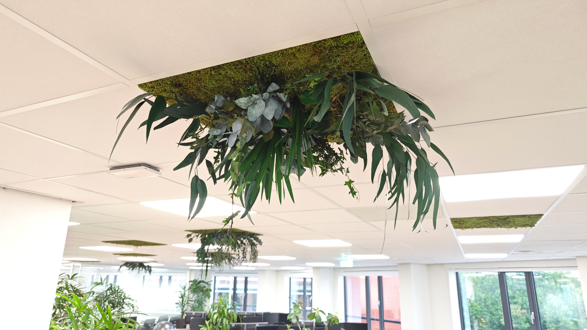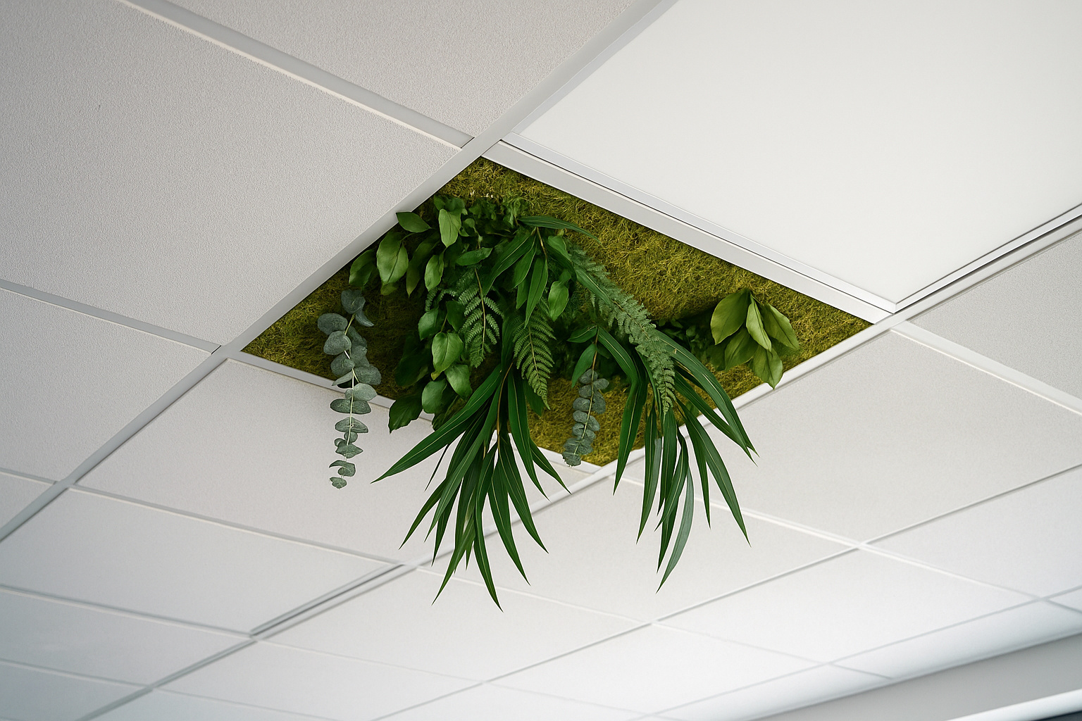 Are you looking for a unique and sustainable way to give your office building, waiting room, reception area or shop a green boost? We offer a wonderful solution with our plant ceiling tiles, which fit perfectly into any suspended ceiling.