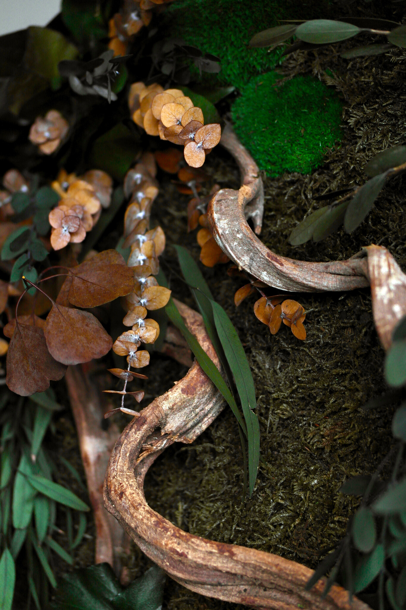 The Jungle variant Liana features a bold appearance with various wooden details. The dark moss in the background creates a beautiful contrast with the diversity of leaves and ferns. Like the moss, the jungle leaves are preserved, ensuring that the jungle painting remains beautiful for years.