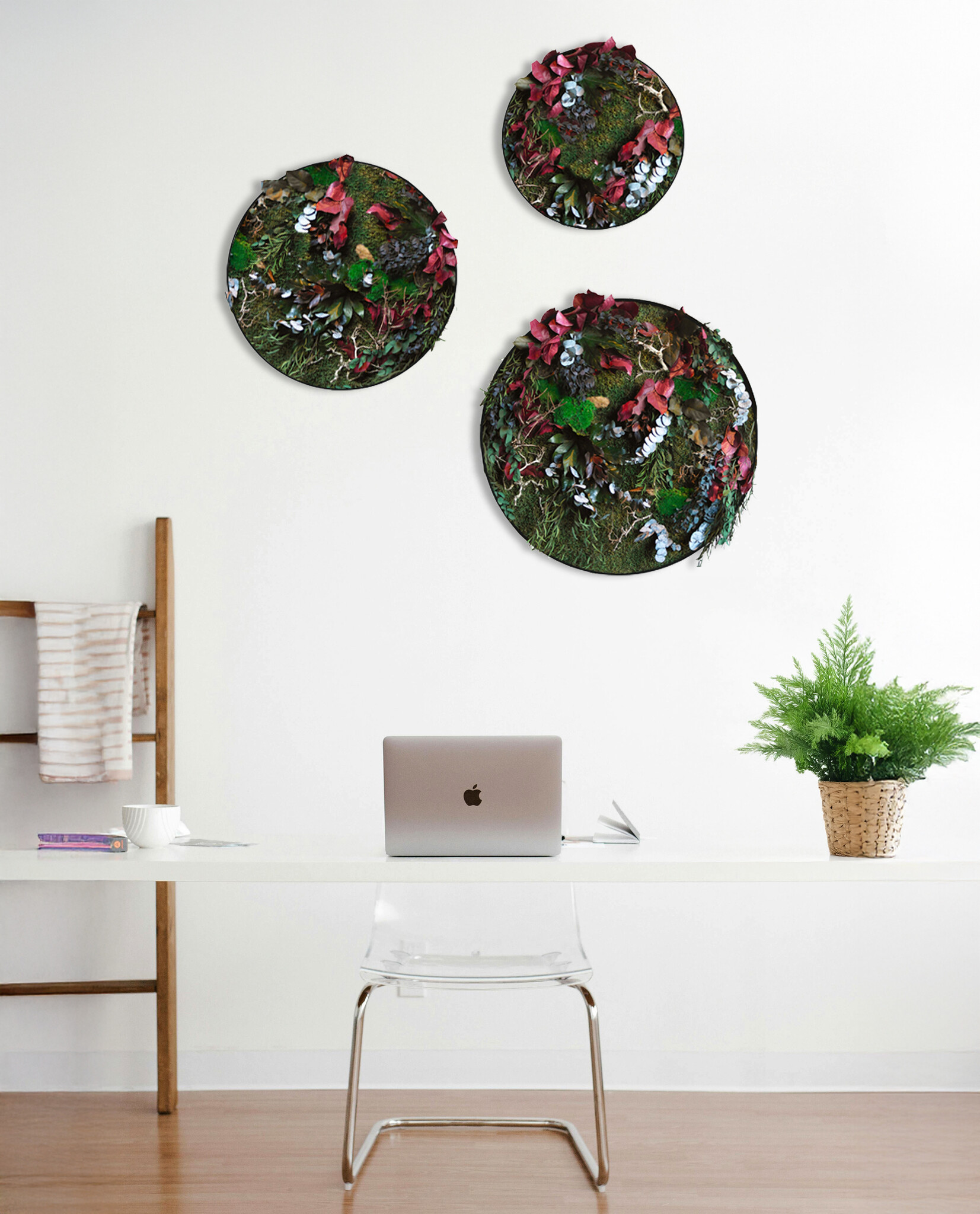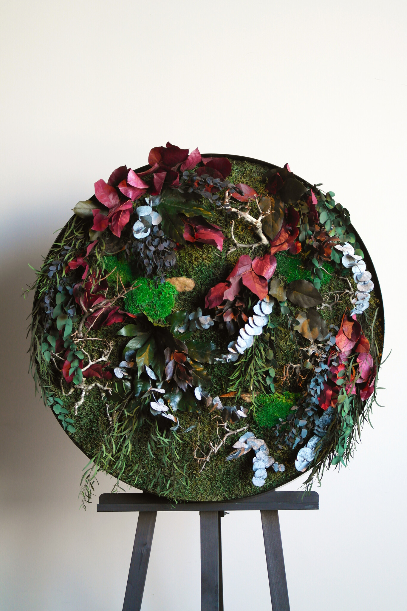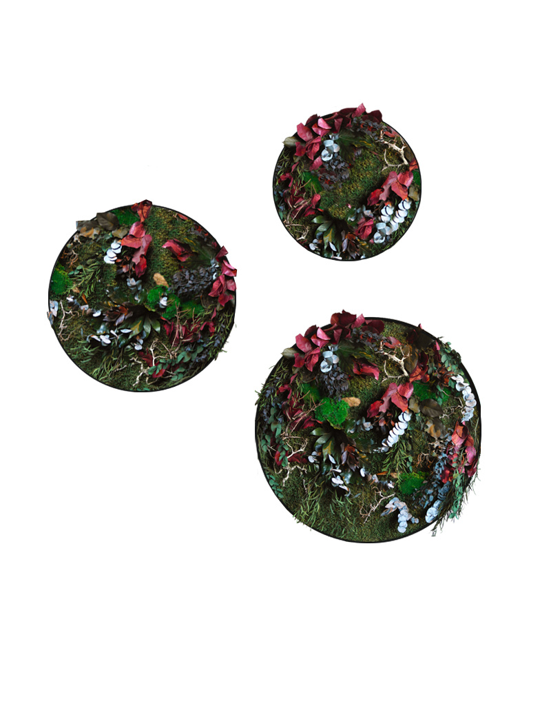 Add a fresh, natural touch to your interior with the jungle circle set Rubina. These vibrant moss circles combine green leaves, red accents, and subtle grey tones with dark flat moss and wooden twigs. Stylish and low-maintenance!