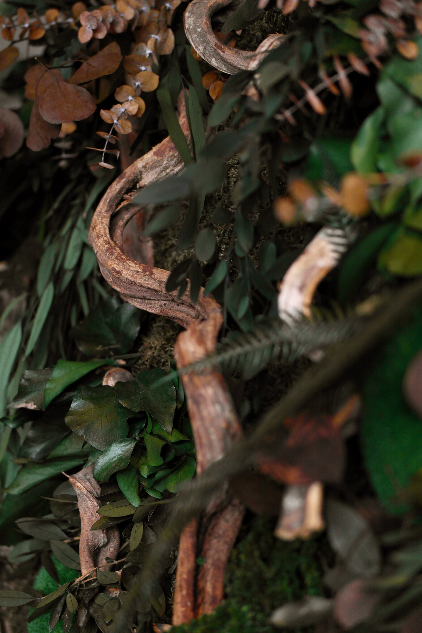 Jungle variant Liana has a tough look with various wooden details. The dark moss in the background provides a nice contrast to the diversity of leaves and ferns. Like the moss, the jungle leaves are also prepared which ensures that the jungle painting remains beautiful for years.