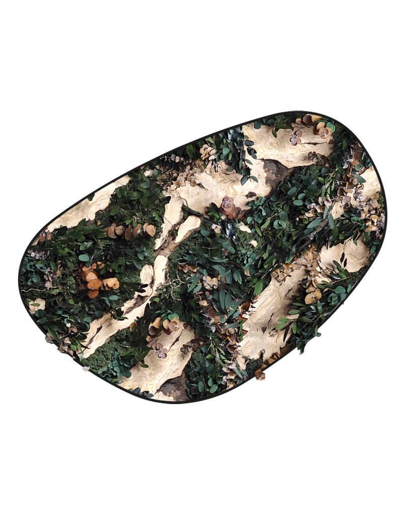 The Jungle variant Rex is a real eye-catcher with a natural and rugged look. The circle features robust pieces of olive wood as a sturdy base, surrounded by eco-moss in the dark green shade Forest. The jungle leaves with brown accents complete the whole. The combination of wood, green, and earthy tones creates a unique style that fits perfectly into any interior. Thanks to the special treatment, the moss and leaves remain beautiful for years, making Rex a lasting piece of nature in your home. A must-have for lovers of natural decoration!