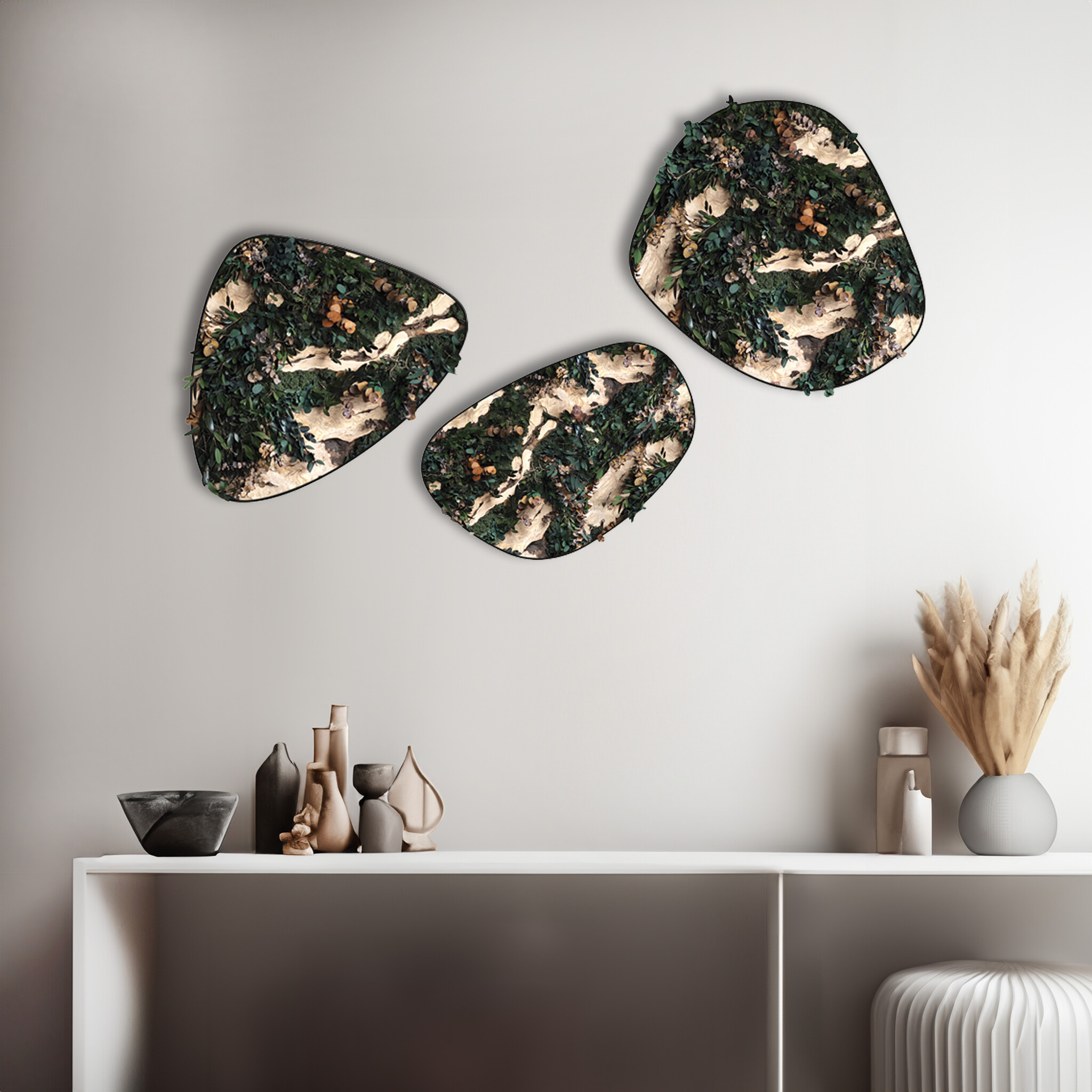 The Jungle variant Rex is a real eye-catcher with a natural and rugged look. The circle features robust pieces of olive wood as a sturdy base, surrounded by eco-moss in the dark green shade Forest. The jungle leaves with brown accents complete the whole. The combination of wood, green, and earthy tones creates a unique style that fits perfectly into any interior. Thanks to the special treatment, the moss and leaves remain beautiful for years, making Rex a lasting piece of nature in your home. A must-have for lovers of natural decoration!
