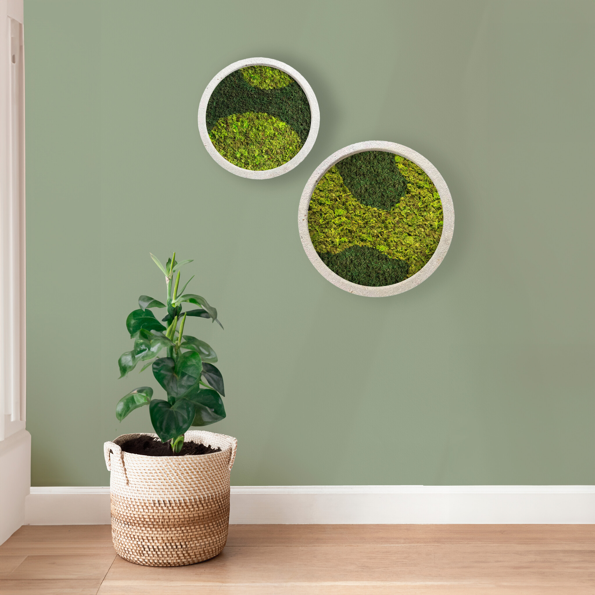 The image shows the pattern of a moss circle diameter 60 cm. As it is a natural product, every moss artwork is unique. Therefore the layout of the purchased moss circle may differ from the selected photo.