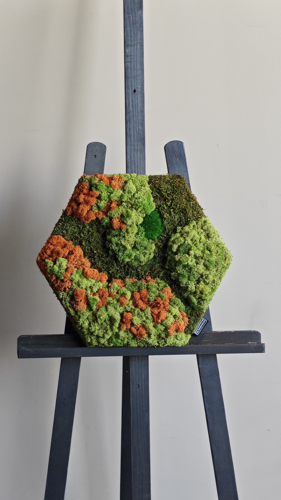 The image shows the pattern of a Hexagon in size 100 cm. As it is a natural product, each moss artwork is unique. As a result, the format of the moss artwork purchased may differ from the selected photo. Should you require a different size? Please contact us at [email protected].