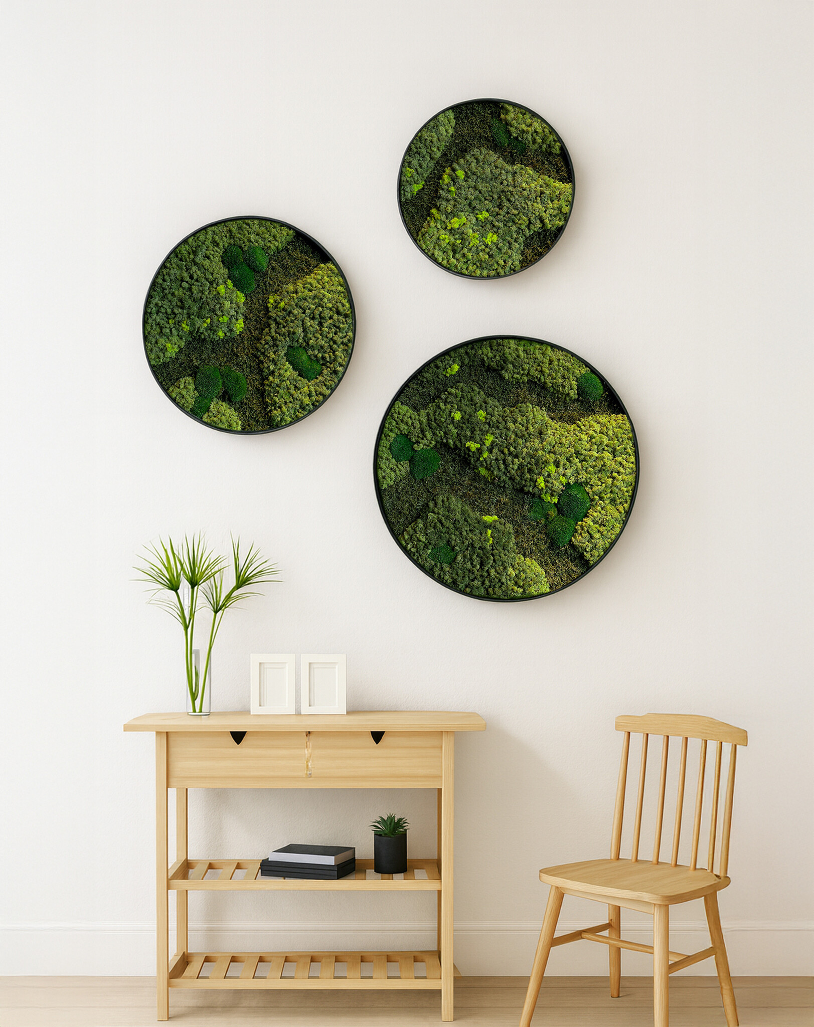 The image shows the mood and design of set 3. As it is a natural product, each moss artwork is unique. Therefore, the layout of the purchased moss circle may differ from the selected photo. Should you require a different size? Please contact us at [email protected].