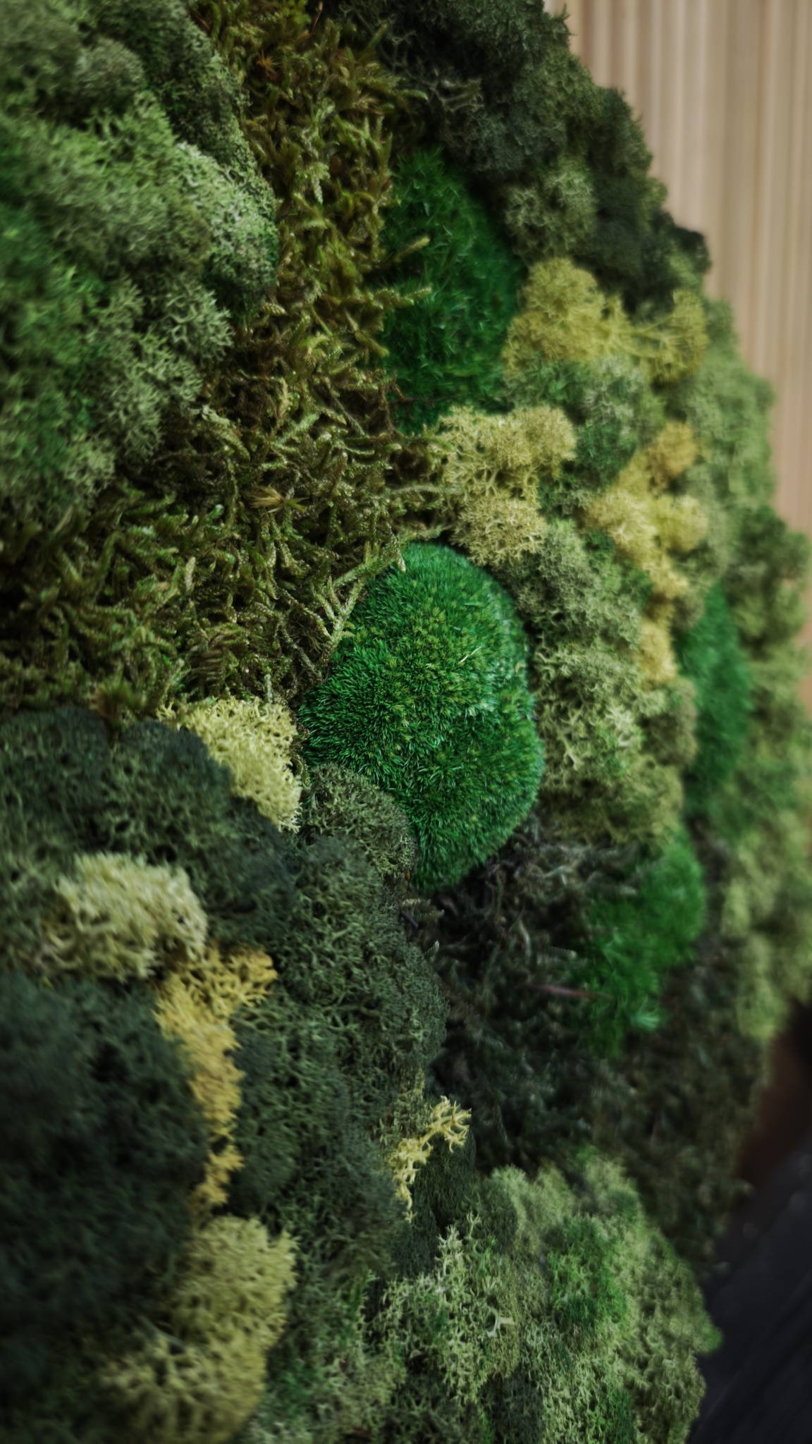 The moss used is a 100% natural product and requires 0% maintenance. Among its properties and advantages are: high acoustic damping, fire-retardant (impregnated), very colourfast, no daylight, dirt-repellent (antistatic) and because the moss is no longer alive, it does not require any maintenance such as watering, pruning or fertilising. The moss creations are beautiful and soft to touch and have great appeal. Our mosses are of the highest quality, ensuring a very long lifespan (10-20 years).