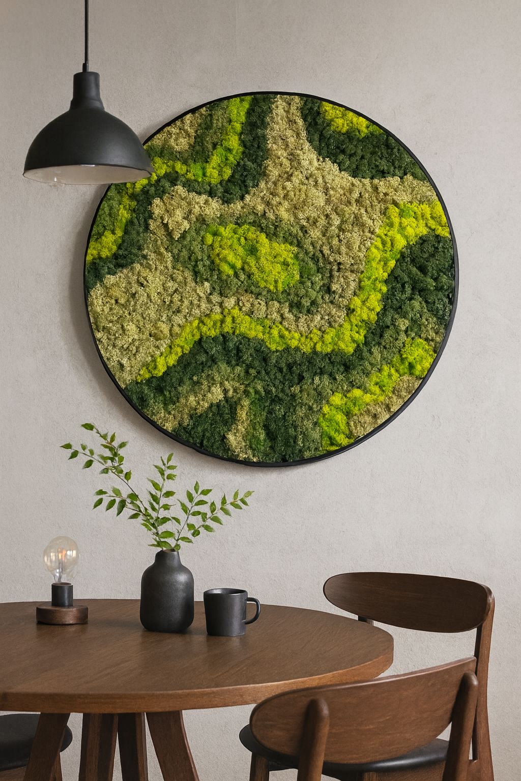The moss circles create a unique green atmosphere, which is perfect for use in (living) kitchens/reception areas/office spaces or above the sofa at home.