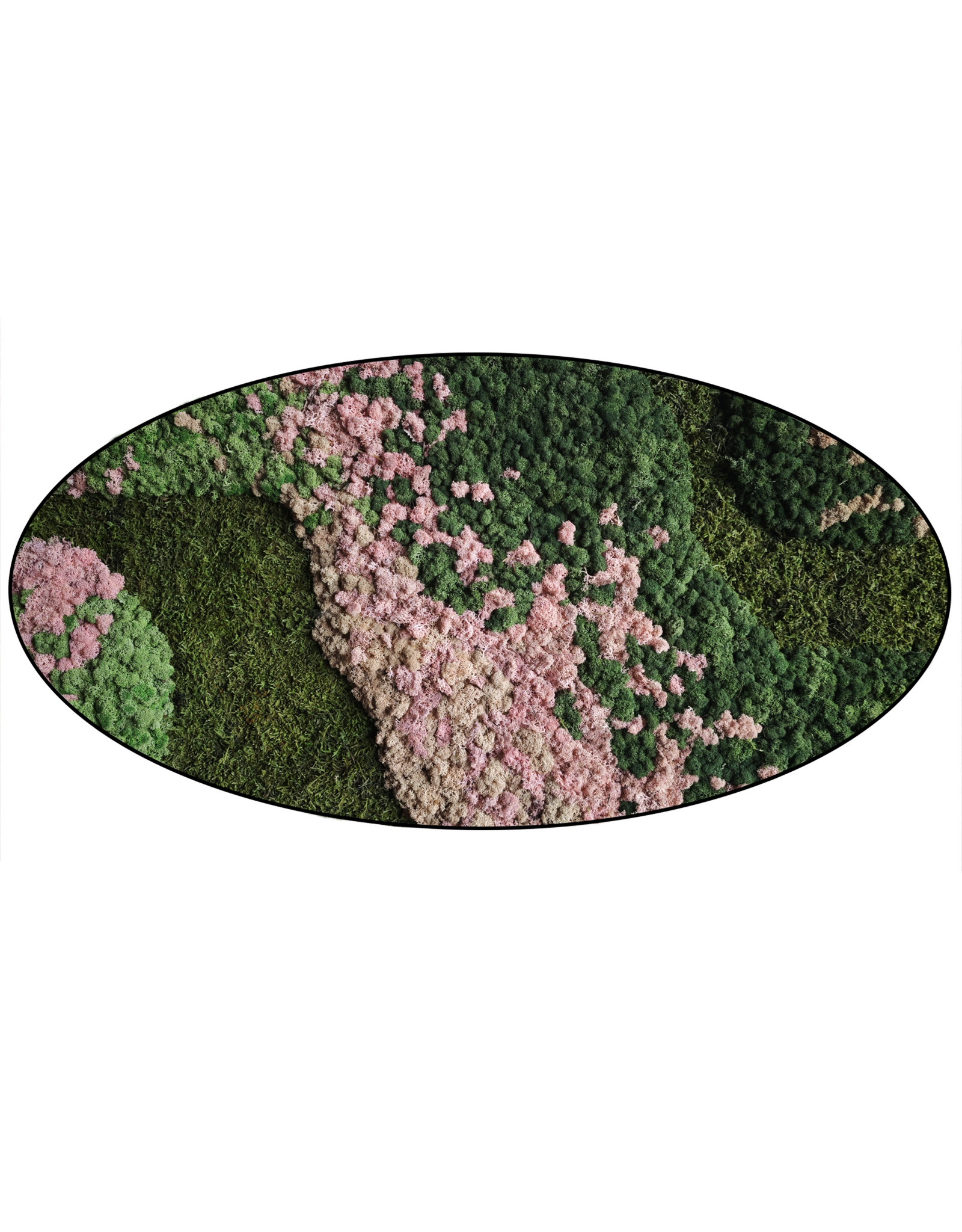 These moss artworks mainly feature different shades of green, ranging from light fresh green to deep dark green. This is often combined with soft accents of pink and beige, creating a warm and playful effect. The mix of colors and different types of moss results in a lively composition with a lot of depth. The artwork has a natural and calm appearance and slightly resembles a small landscape.