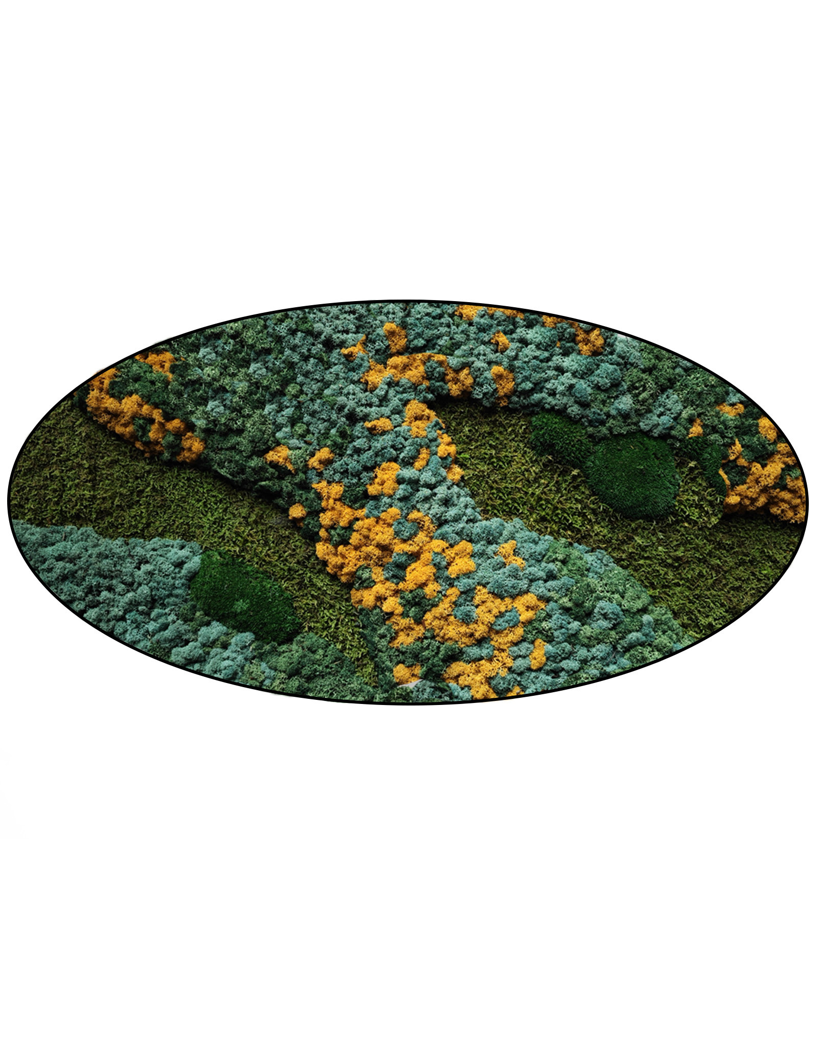 This beautiful moss painting features a harmonious blend of natural colors and textures, creating a vibrant and organic work of art. The shades "Solis" (yellow-orange), "Pacem" (turquoise), and "Ocean" (sea blue) are dynamically distributed across the painting.