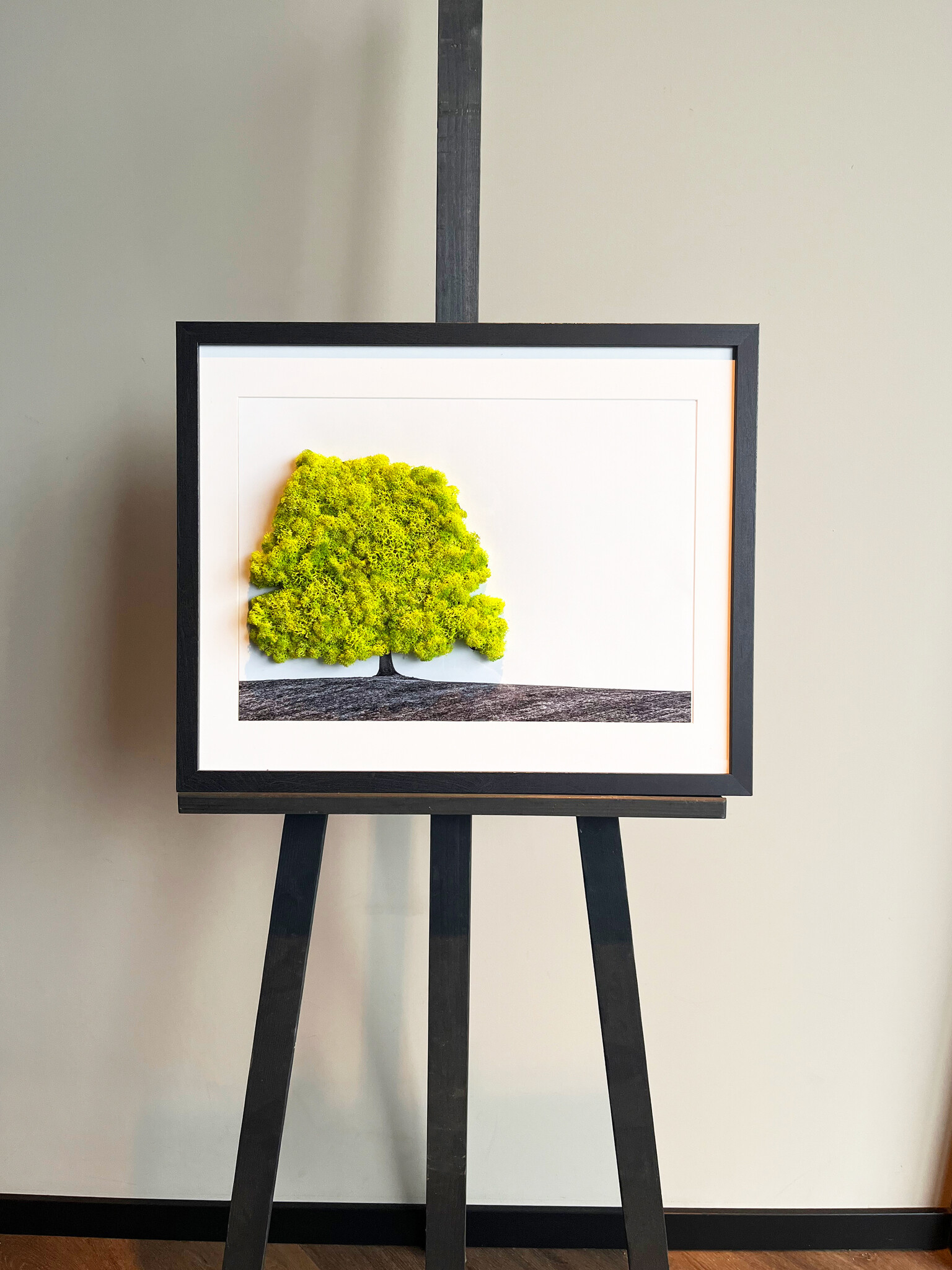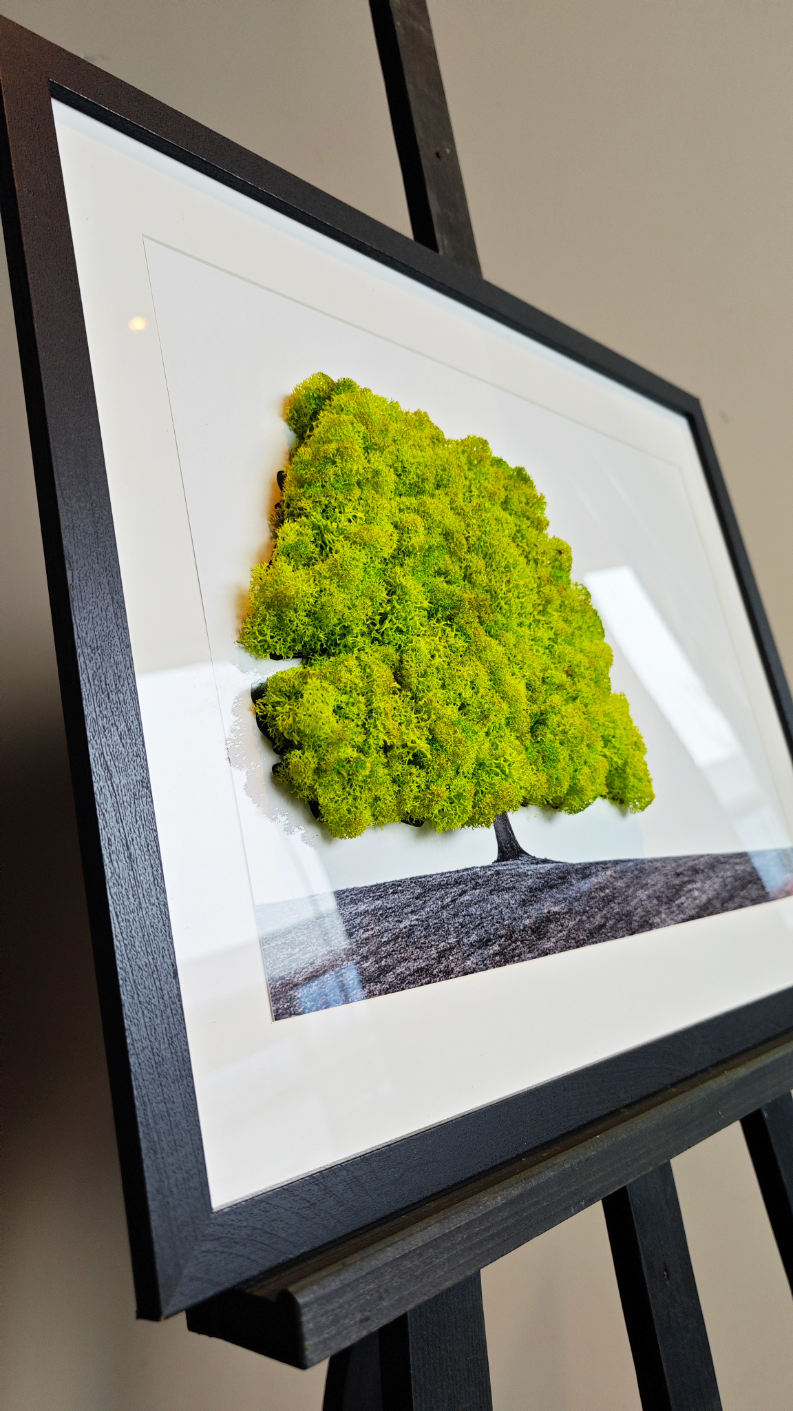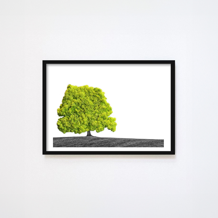 And the best part? They're surprisingly affordable. Whether you're looking for a striking painting for your living room or a unique gift, there's a moss portrait that will appeal to everyone. Available in different designs, frame sizes, and moss color variations! So you can mix and match endlessly. Very charming, for example, for an art gallery, office space, hotel, or a cozy living room. This portrait of a landscape adds a majestic and calming atmosphere.