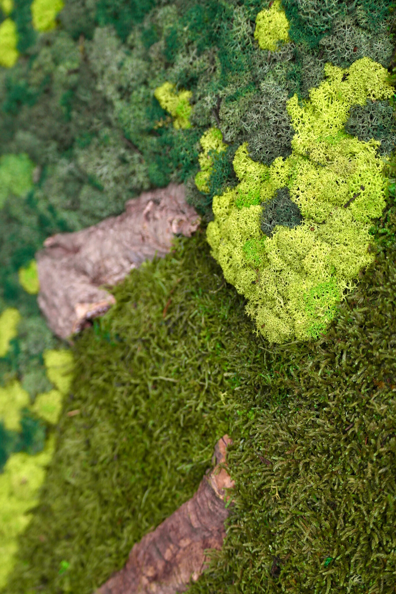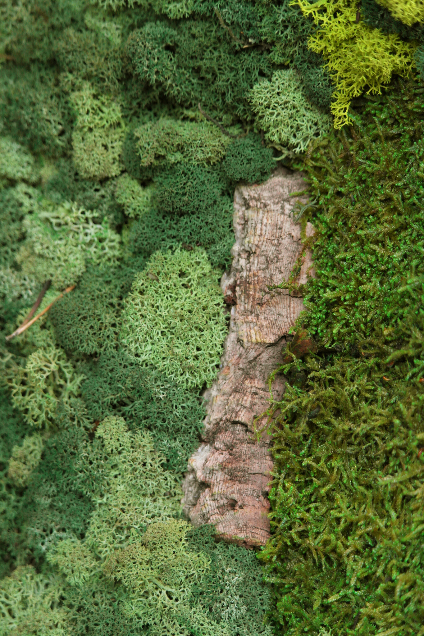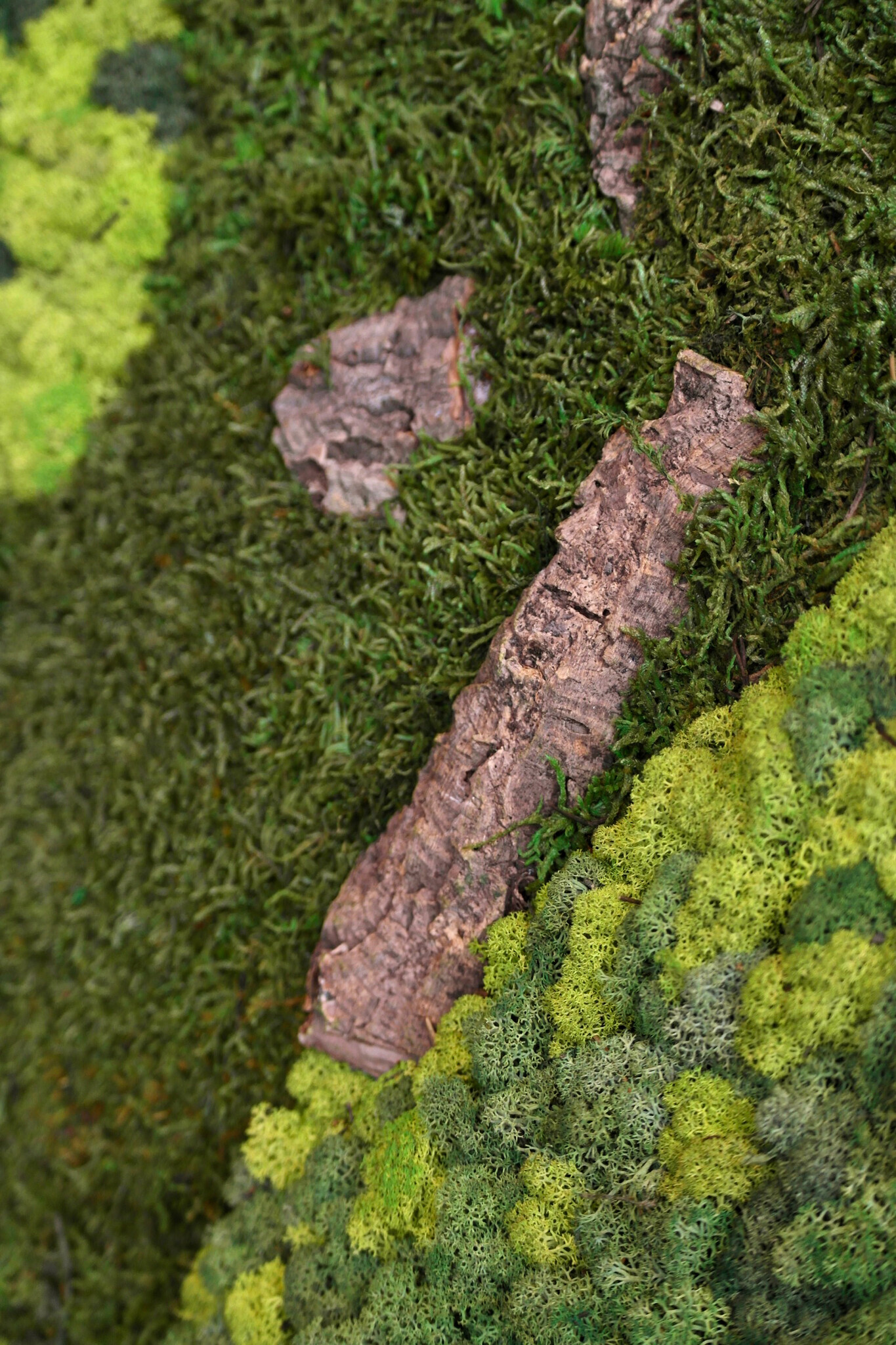 This is moss variety Kaiju. A moss mix consisting of reindeer moss, flat moss, bulb moss and cork. The cork is reddish-brown in colour and contains deep grooves. This gives the moss artwork an interesting texture and a natural contrast along the soft, lush green of the mosses.