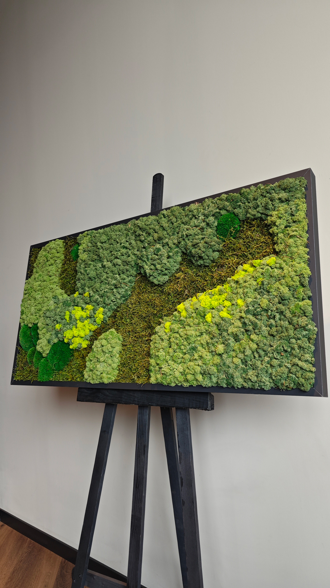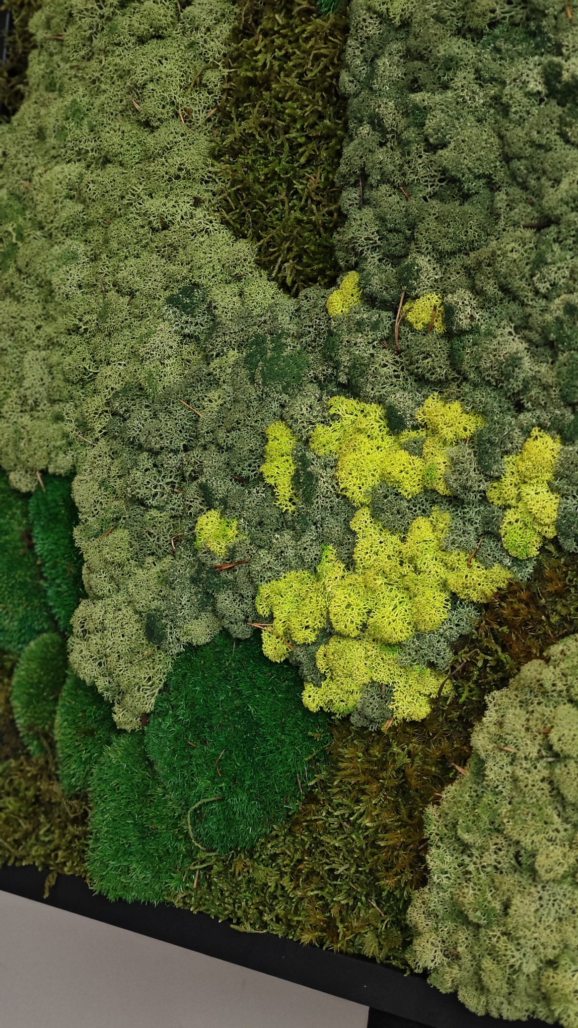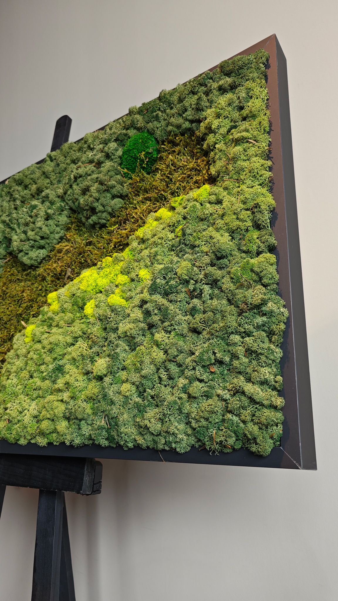 The best-selling moss style is the Jellina style. This is because of the natural relief between the different mosses we apply. The moss artwork has an exciting look because we incorporate some brighter tufts of moss. This moss style also includes Reindeer moss, flat moss and bulb moss, creating a natural height difference.
