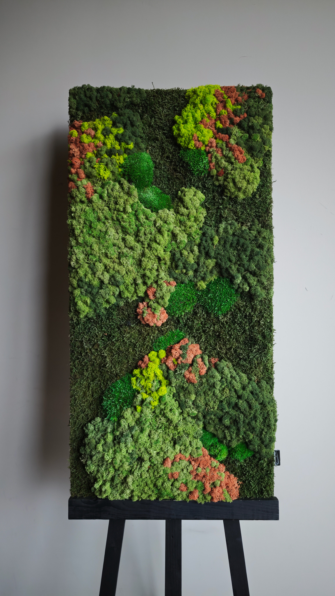 Moss artwork Kaisa is a beautiful moss artwork that uniquely brings nature into the home. This moss artwork consists of a moss mix of flat moss, bulb moss and reindeer moss. The use of the two vibrant accent colours Persici red and bright green creates a vibrant moss artwork. The deep contrast in the moss artwork is emphasised by the dark flat moss. Perfect for a touch of nature in any room!