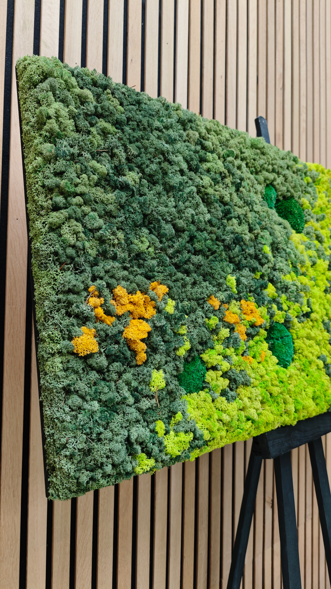 The Sundara moss style is a vibrant and energetic composition of reindeer moss, perfectly attuned to the feeling of summer. The mix of different shades of reindeer moss adds depth and movement to the piece, while the yellow tones provide a cheerful, warm appearance. Sundara is the ideal choice for anyone looking to refresh their interior with a natural eye-catcher that brings summer energy into the space all year round.