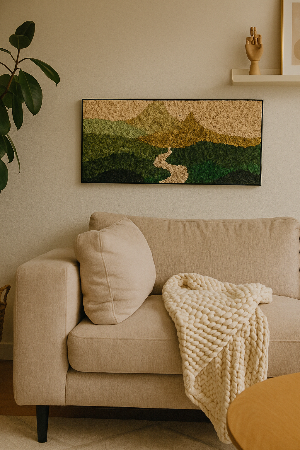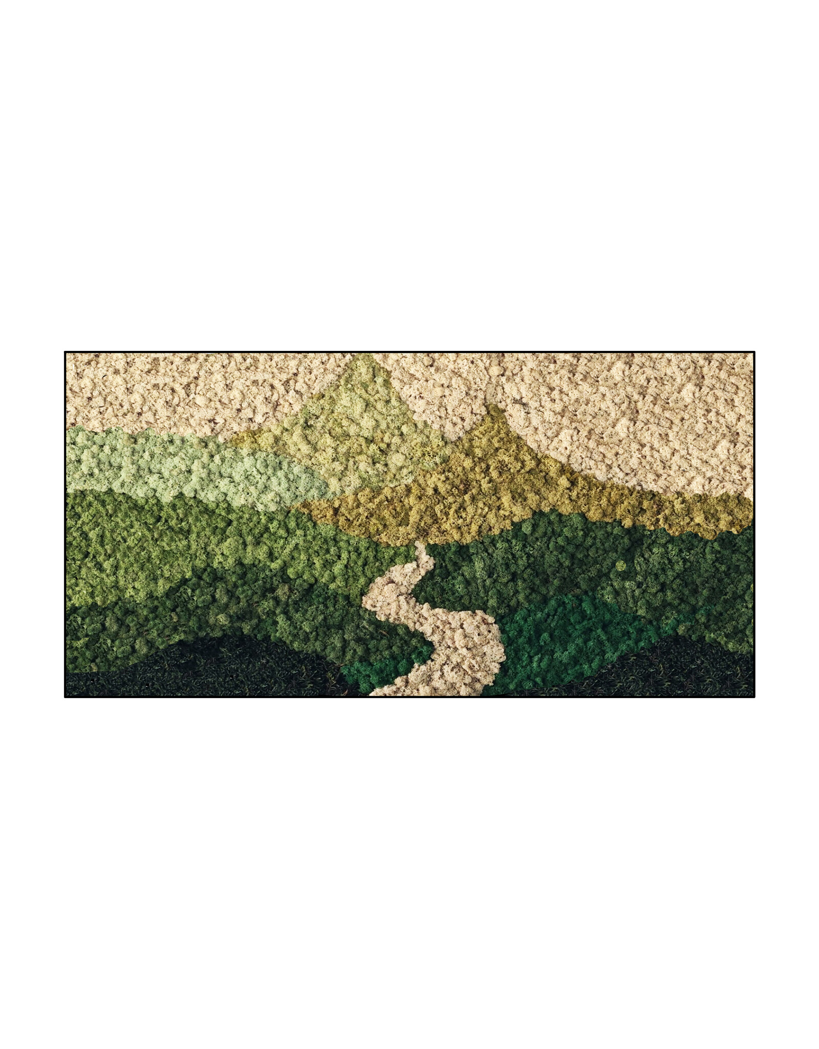 Valley is a moss artwork with a strong and clear design. The different shades of green create an impressive sense of depth, allowing the mountains to really stand out. The light colour of the river contrasts beautifully with the green and enhances the landscape of the piece. This moss artwork truly makes a statement and is an eye-catcher in any room. Thanks to the use of moss, Valley combines an artistic look with a playful and natural charm.