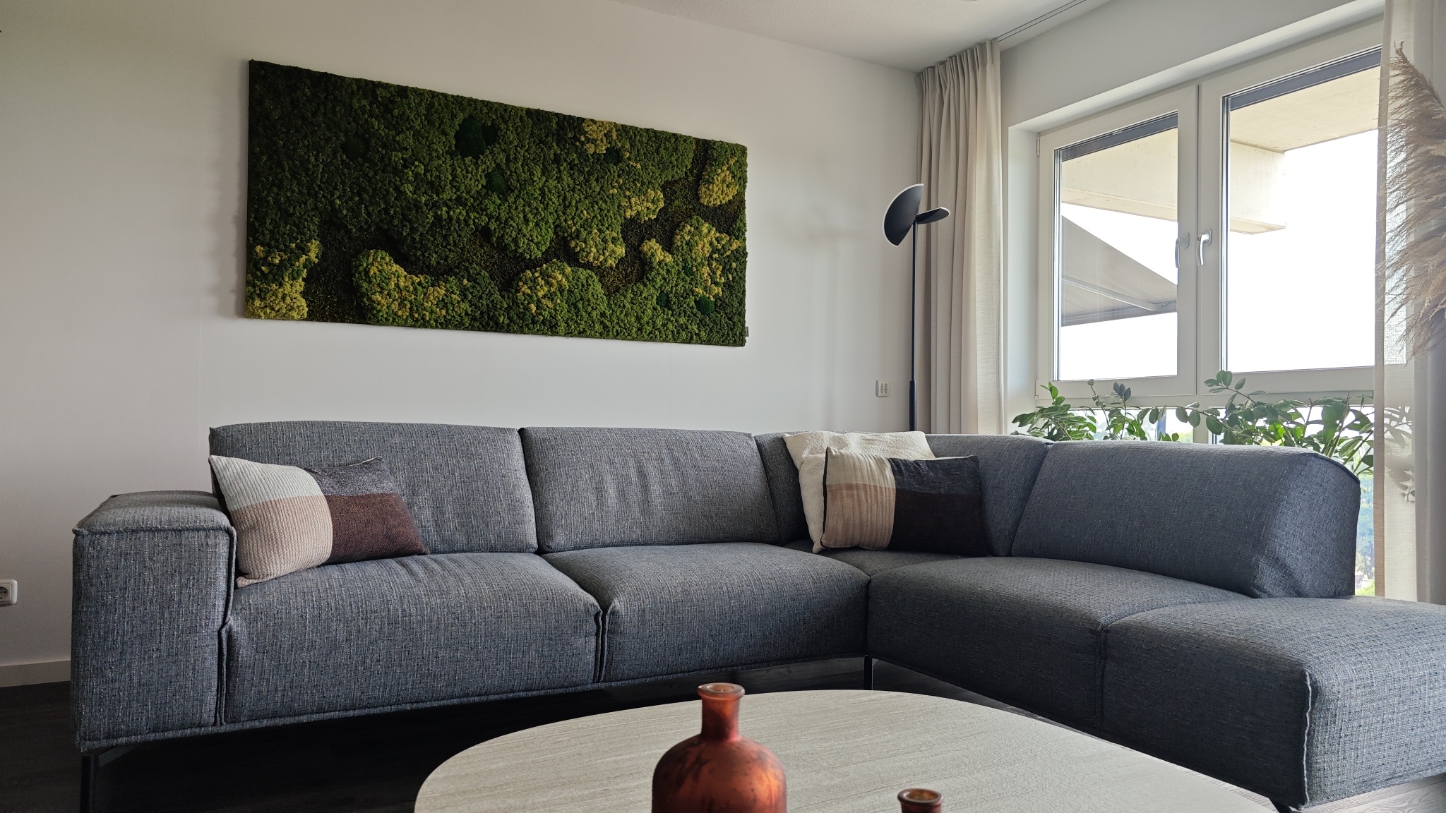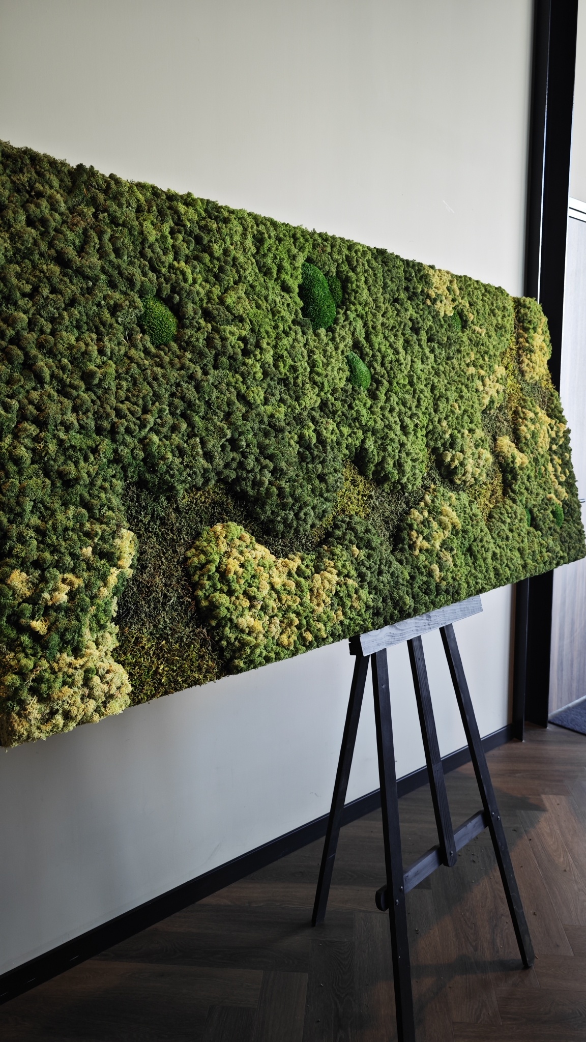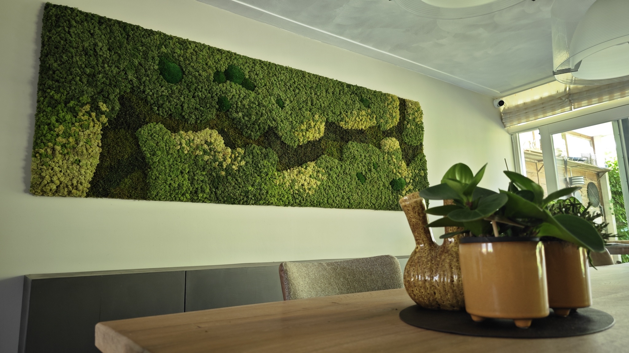 Our moss artwork creates a unique green atmosphere, which is perfect for use in (living) kitchens/reception areas/office spaces or above the sofa at home.