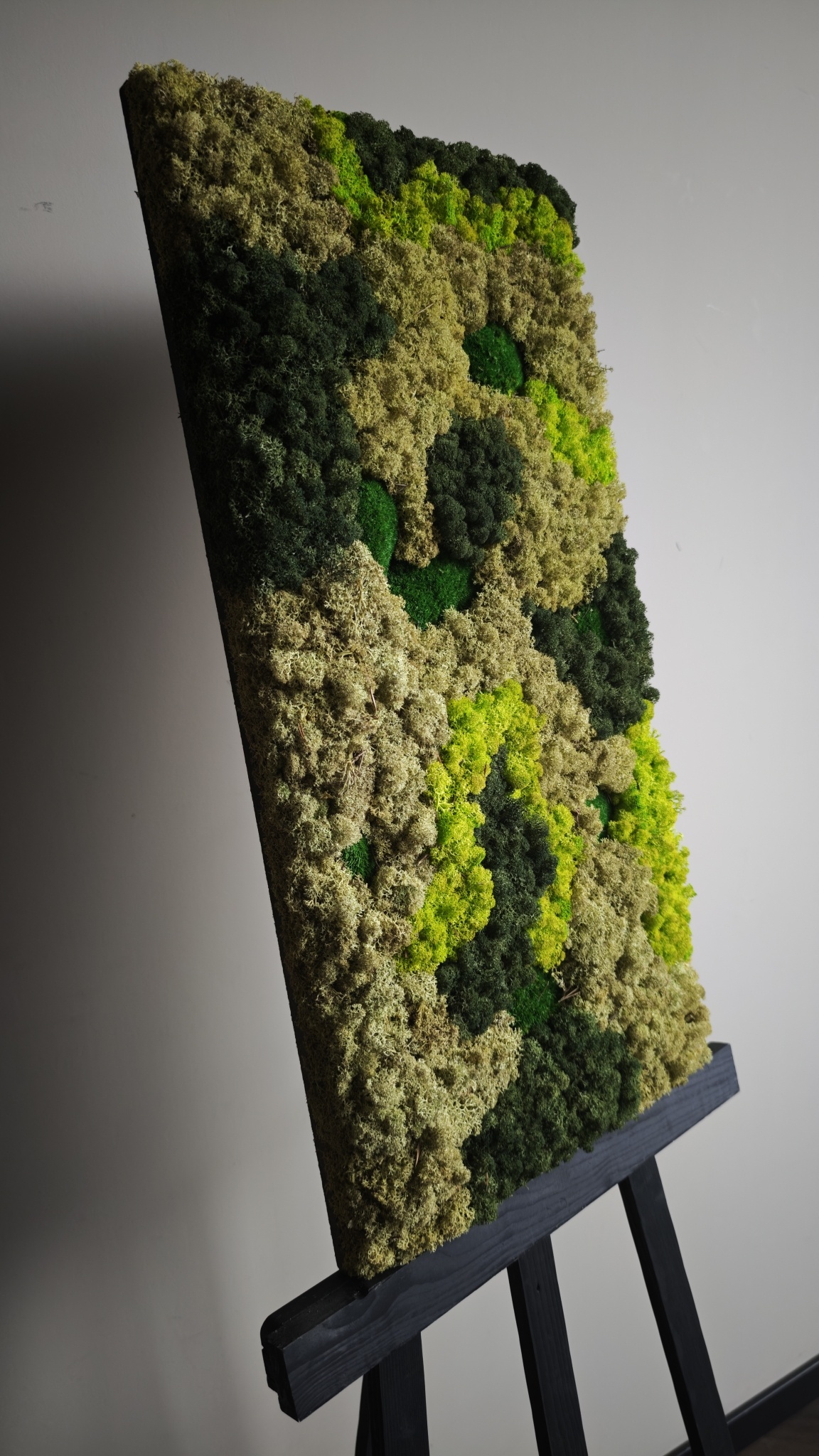 This moss artwork made of reindeer moss and cushion moss is instantly recognisable by the calm organic lines that run through the entire piece. The gentle waves of reindeer moss create a natural design and the varied green tones make this artwork suitable for many interior styles.