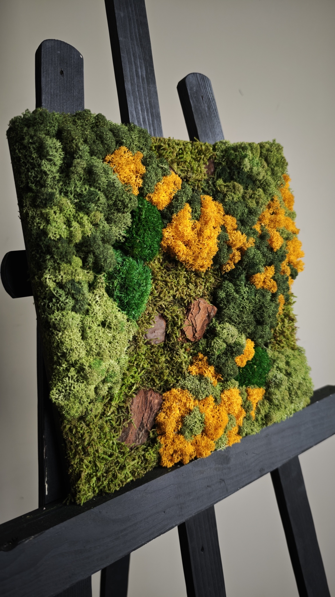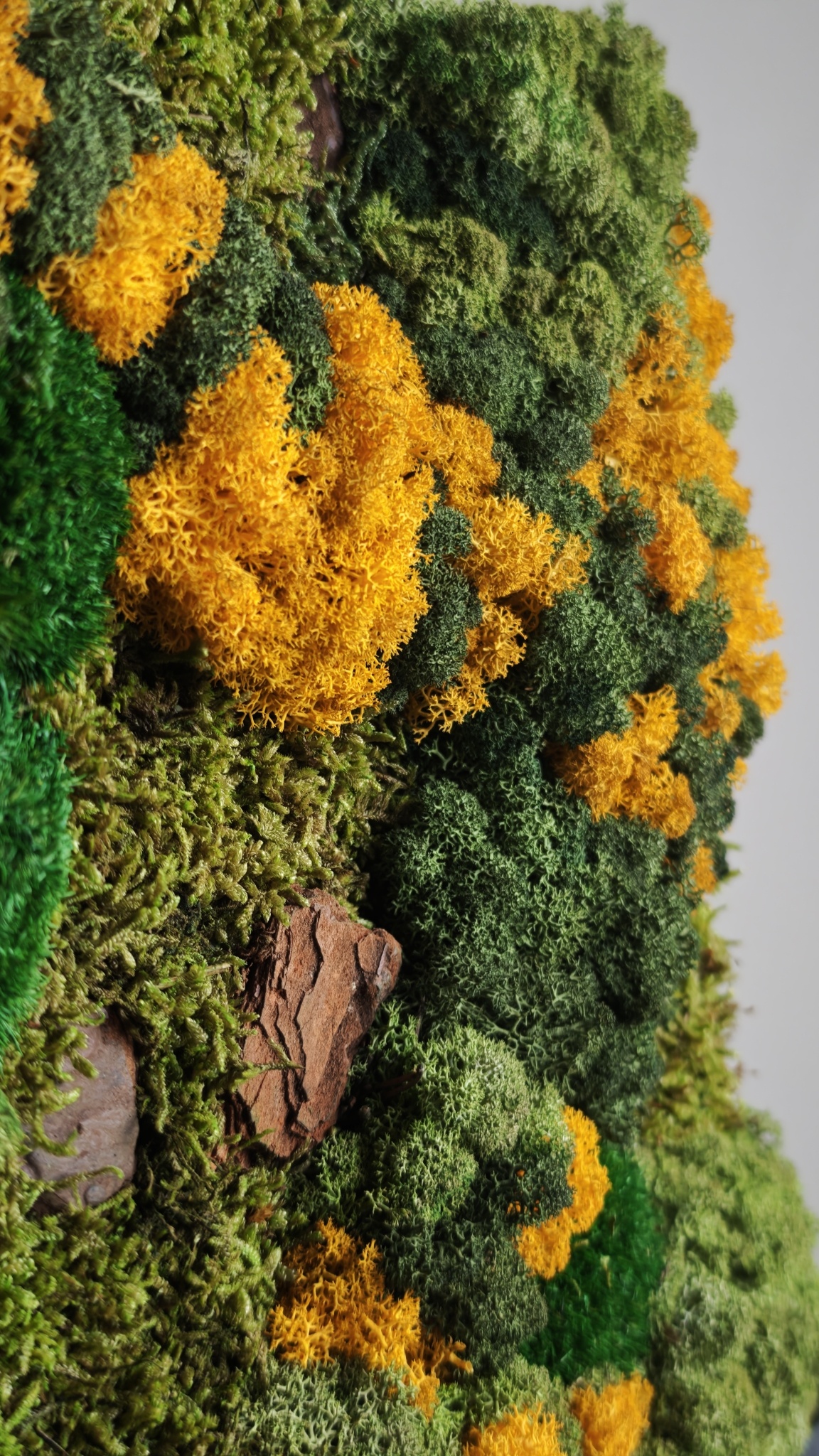 Do you like fresh colours and want to brighten up your space with an orange/ochre yellow colour? Then moss variant Gobi is the style that suits your interior. In this moss artwork, we have incorporated bark as an additional detail, creating a beautiful mix of natural materials!