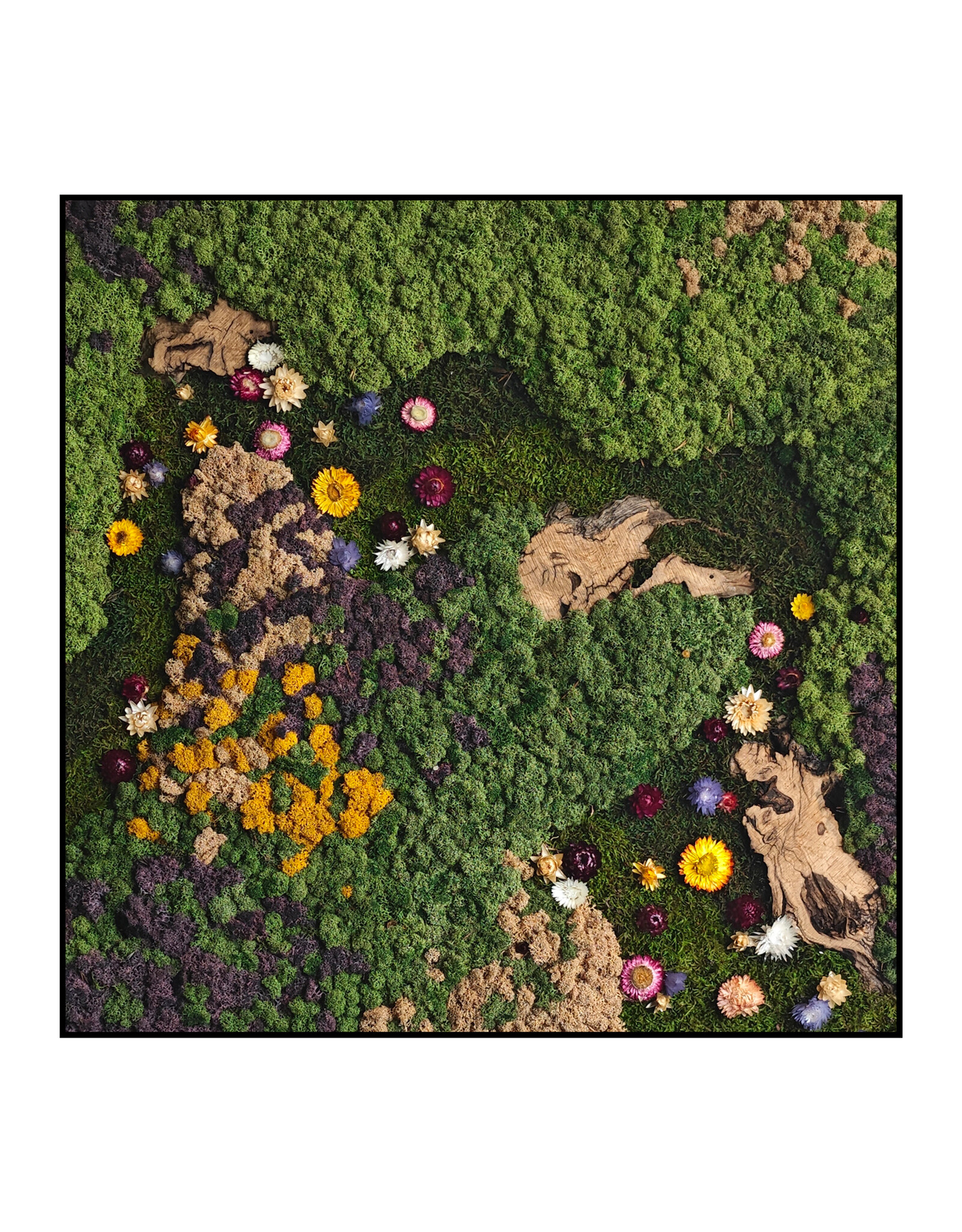 In the Luvina moss artwork, various types of moss are combined with dried flowers and natural wooden elements. A river of flat moss flows through the center, accented by dried flowers in fresh, vibrant colors. Around this river lies a mix of reindeer moss in green, dark green, salmon, yellow, and purple. A beautiful and lively look that refreshes your interior in a natural way.