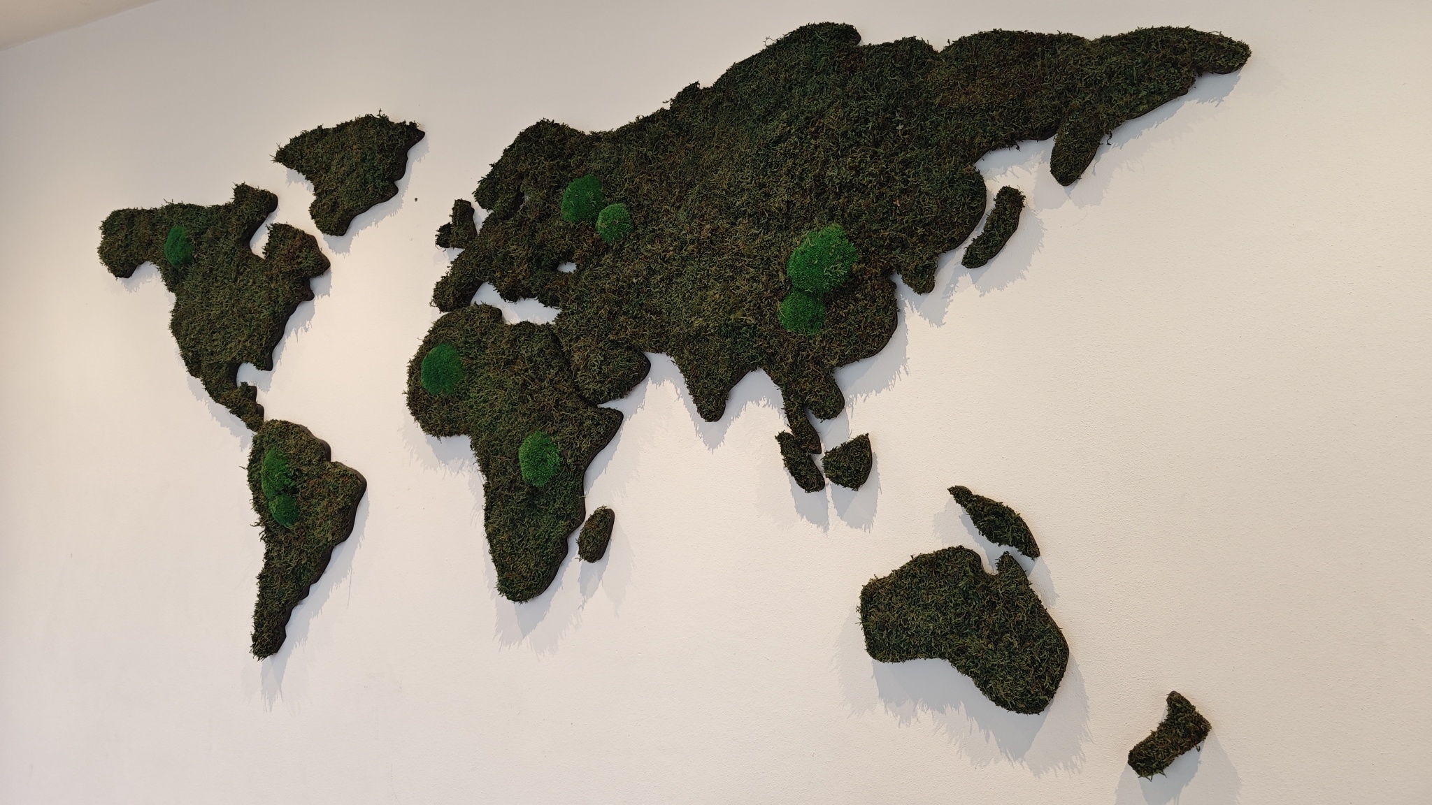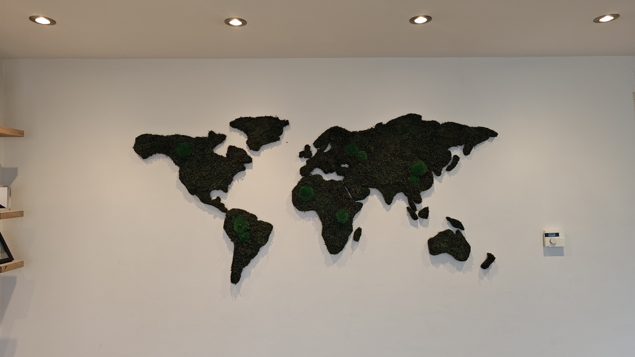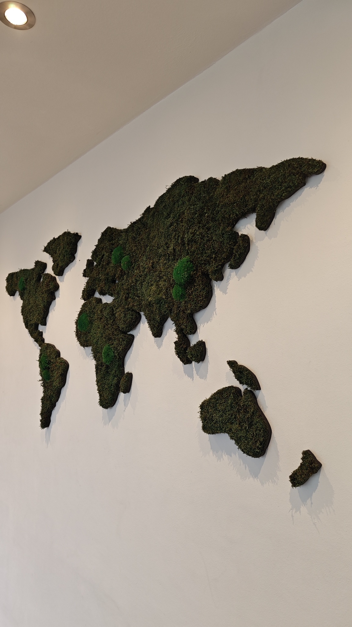 The world map has a from diameter of 200 cm wide x 95 cm high. It has a total weight of 15-20 KG. Depending on which options you choose. You can order a mould with the world map, on which each part is numbered. There is also a number on the back of the mossed panel. This way, you can easily hang up the world map yourself. If you hang up the world map with double-sided pads, you can use a bit of sealant for extra reinforcement.