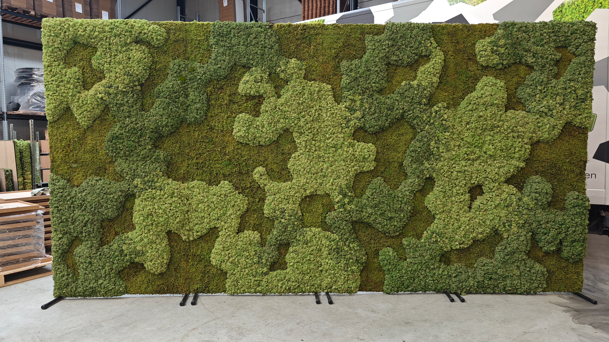 • The moss is 100% natural but no longer alive. It has been treated with salts to ensure it is fully fire-retardant, does not attract insects, and retains its fresh appearance. The wall also contributes to a pleasant acoustic environment.