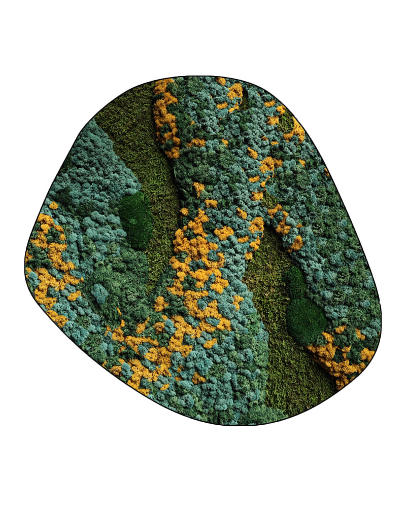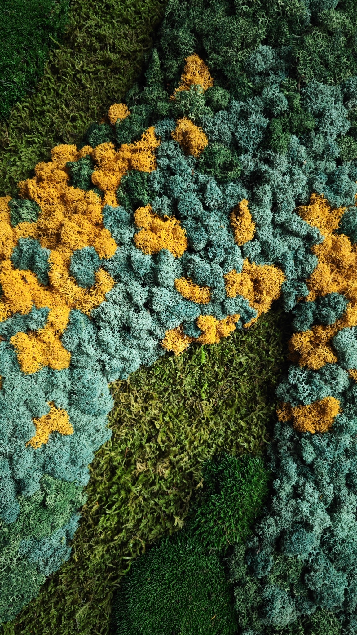 This beautiful moss painting features a harmonious blend of natural colors and textures, creating a vibrant and organic work of art. The shades "Solis" (yellow-orange), "Pacem" (turquoise), and "Ocean" (sea blue) are dynamically distributed across the painting.