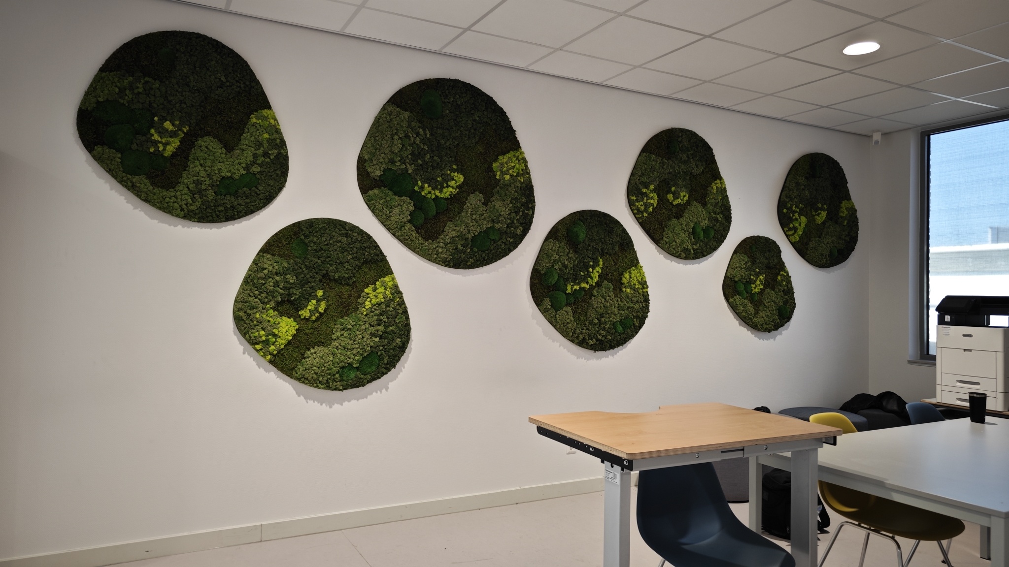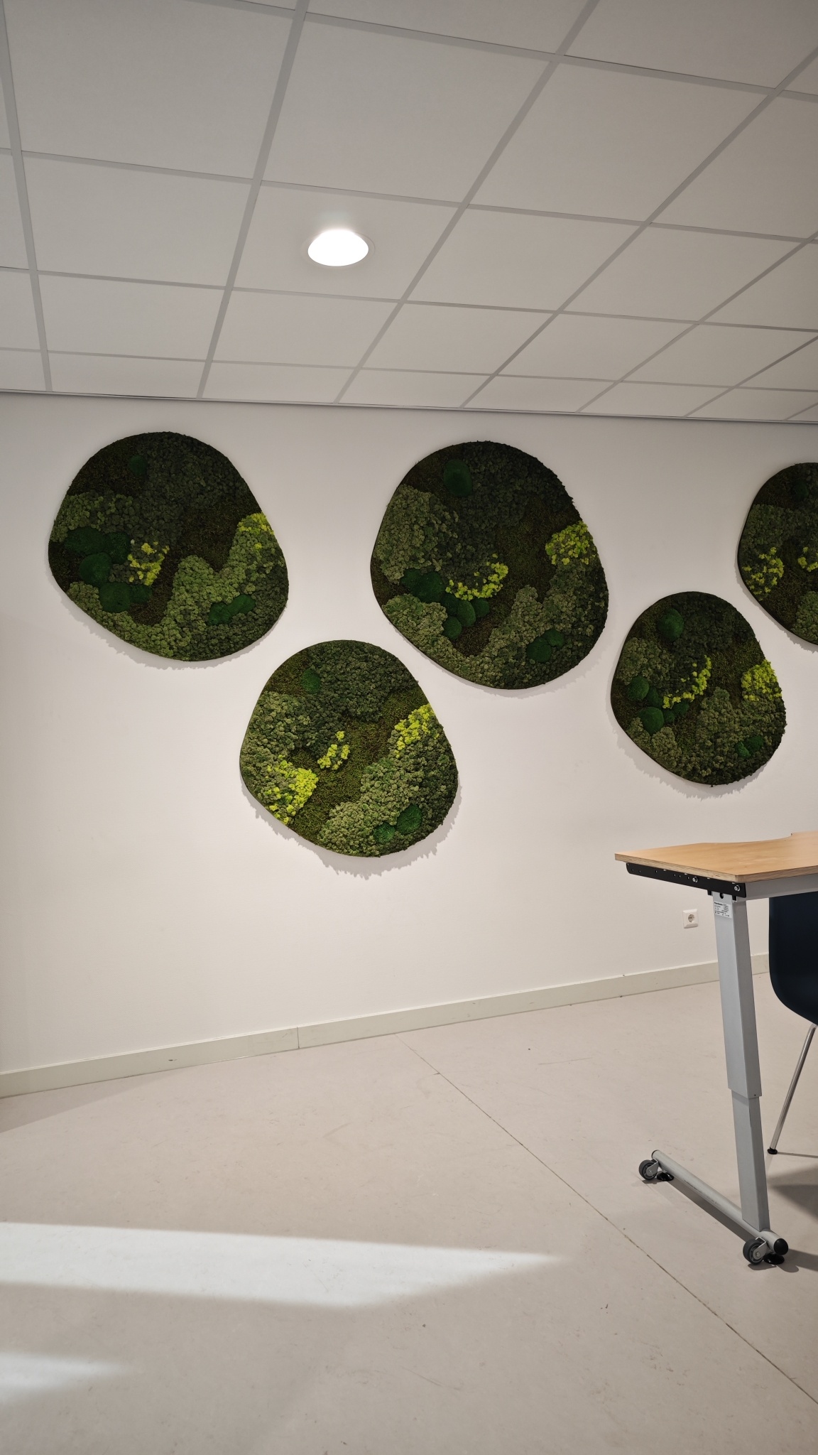 A mossdot 100 cm in diameter has a weight of +/- 10-15 KG. We can also incorporate an optional acoustic plate (AkMOStico) in the moss artwork for optimal sound absorption. This provides 15% more sound absorption! The dots have suspension eyes, so you can easily hang it yourself.
