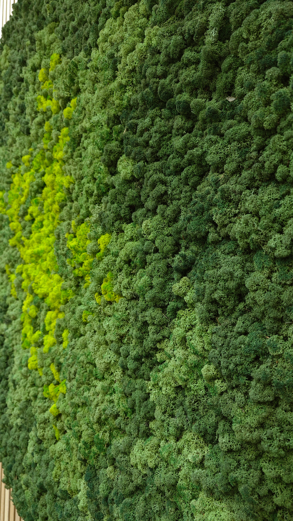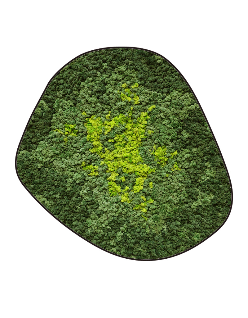 Moss artwork Splash consists of three colors of reindeer moss, radiating roughly from the center outward. The design features a bright green core that gradually fades into a dark green color, highlighting the natural transition found in nature. The organic design and use of natural materials create a refined and soothing appearance.