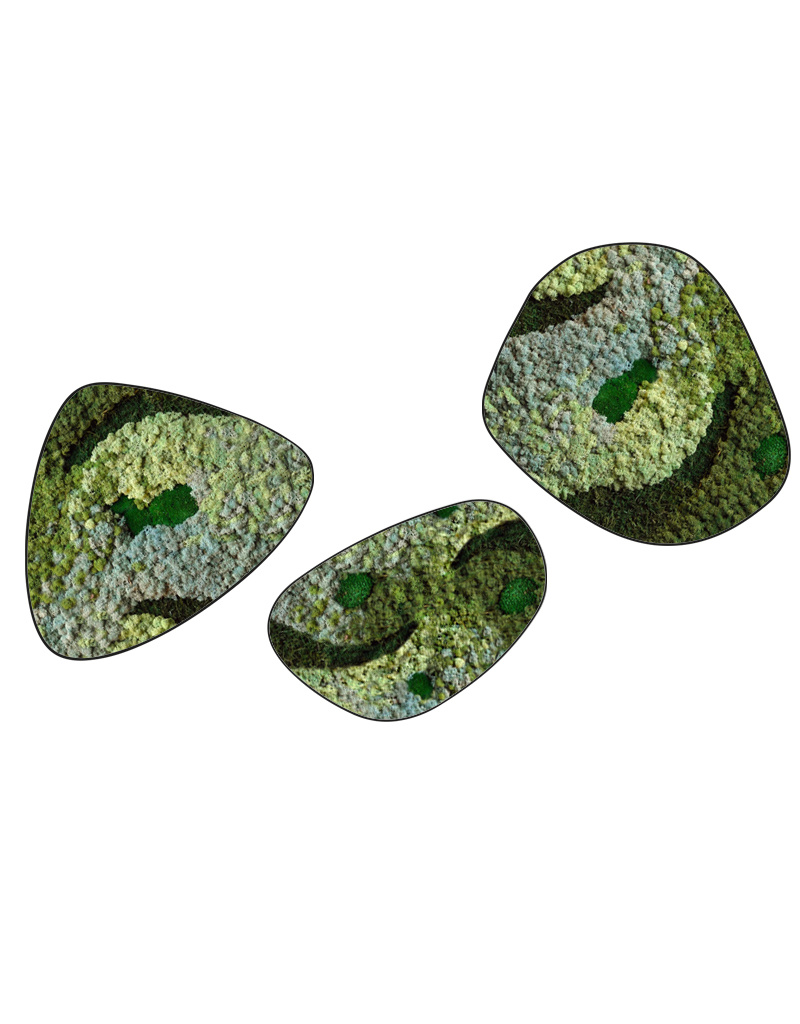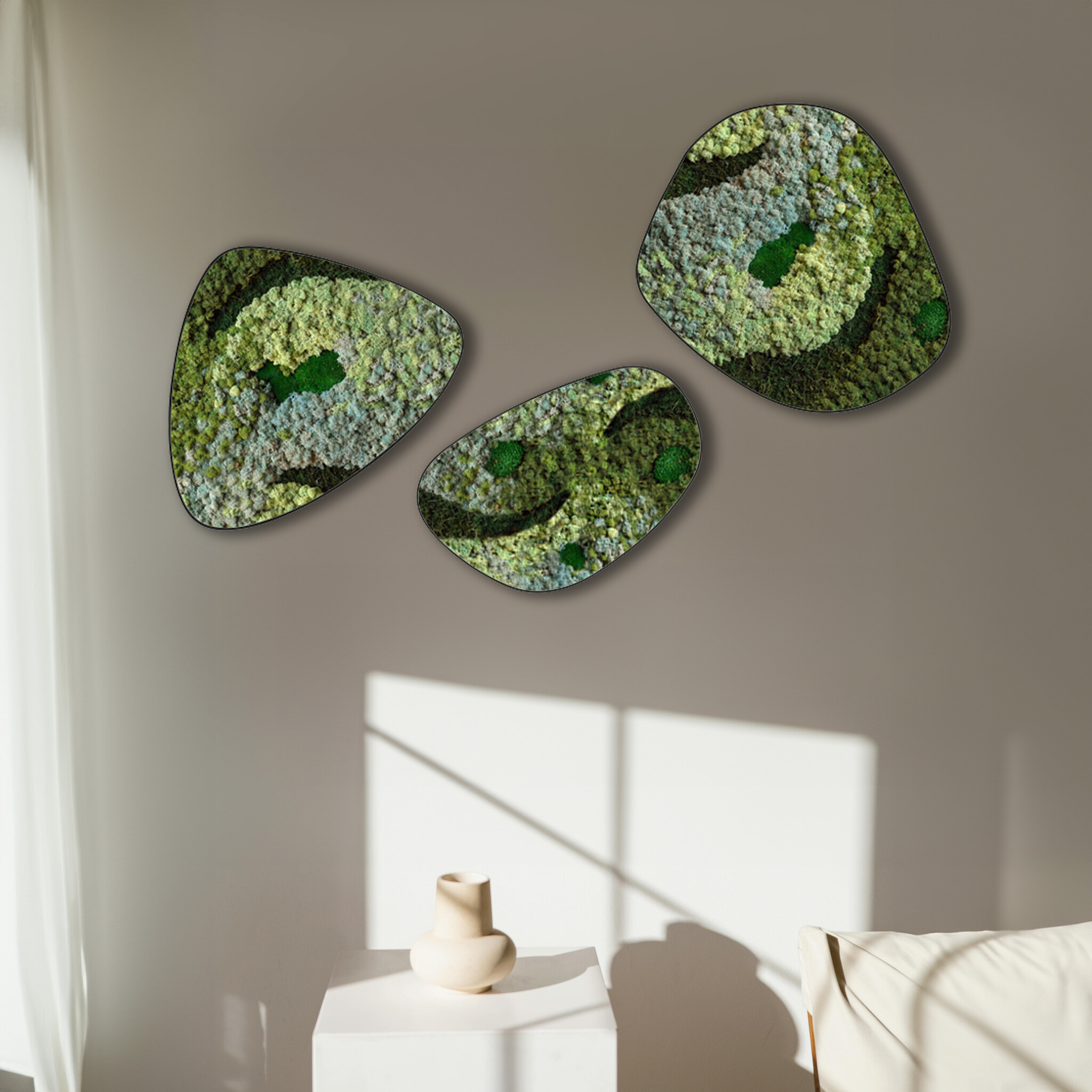 The dimensions are measured from the widest point. The image shows the pattern of a moss dot set in the size 100-100-100 cm (set 4). As it is a natural product, every moss artwork is unique. Therefore, the layout of the moss artwork purchased may differ from the selected photo. Should you require a different size? Please contact us at [email protected].
