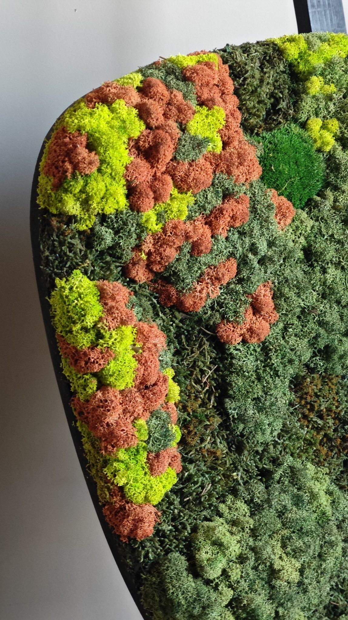 Moss artwork Kaisa is a beautiful moss artwork that uniquely brings nature into the home. This moss artwork consists of a moss mix of flat moss, bulb moss and reindeer moss. The use of the two vibrant accent colours Persici red and bright green creates a vibrant moss artwork. The deep contrast in the moss artwork is emphasised by the dark flat moss. Perfect for a touch of nature in any room!