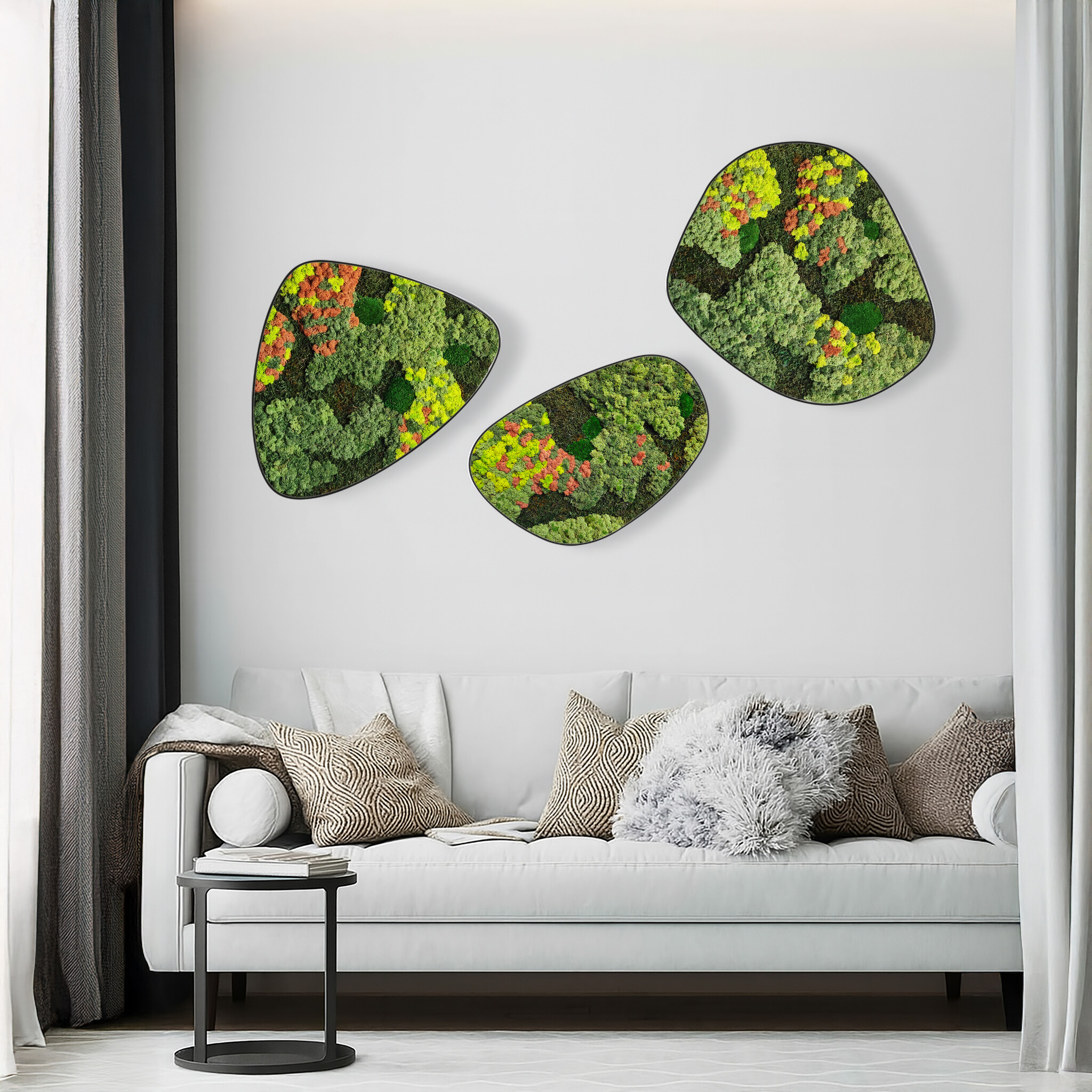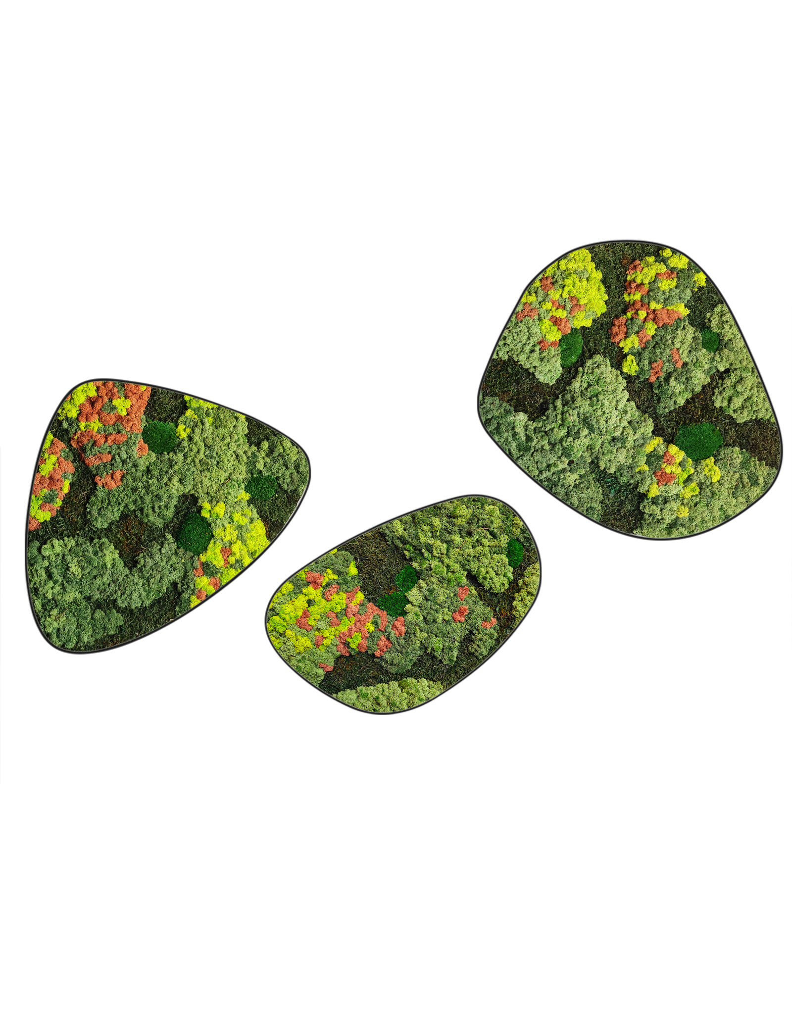 The dimensions are measured from the widest point. The image shows the pattern of a moss dot set in the size 100-100-100 cm (set 4). As it is a natural product, every moss artwork is unique. Therefore, the layout of the moss artwork purchased may differ from the selected photo. Should you require a different size? Please contact us at [email protected].