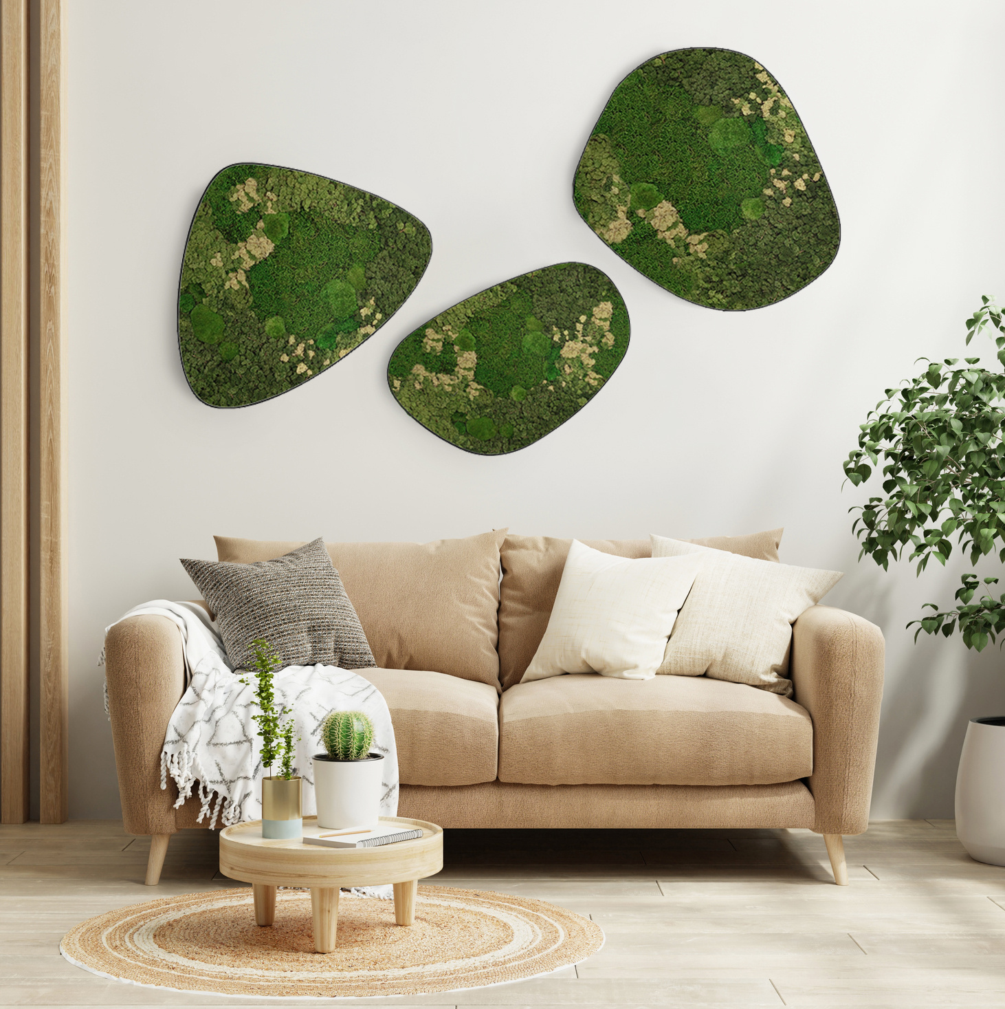 The dimensions are measured from the widest point. The image shows the pattern of a moss dot set in the size 100-100-100 cm (set 4). As it is a natural product, every moss artwork is unique. Therefore, the layout of the moss artwork purchased may differ from the selected photo. Should you require a different size? Please contact us at [email protected].