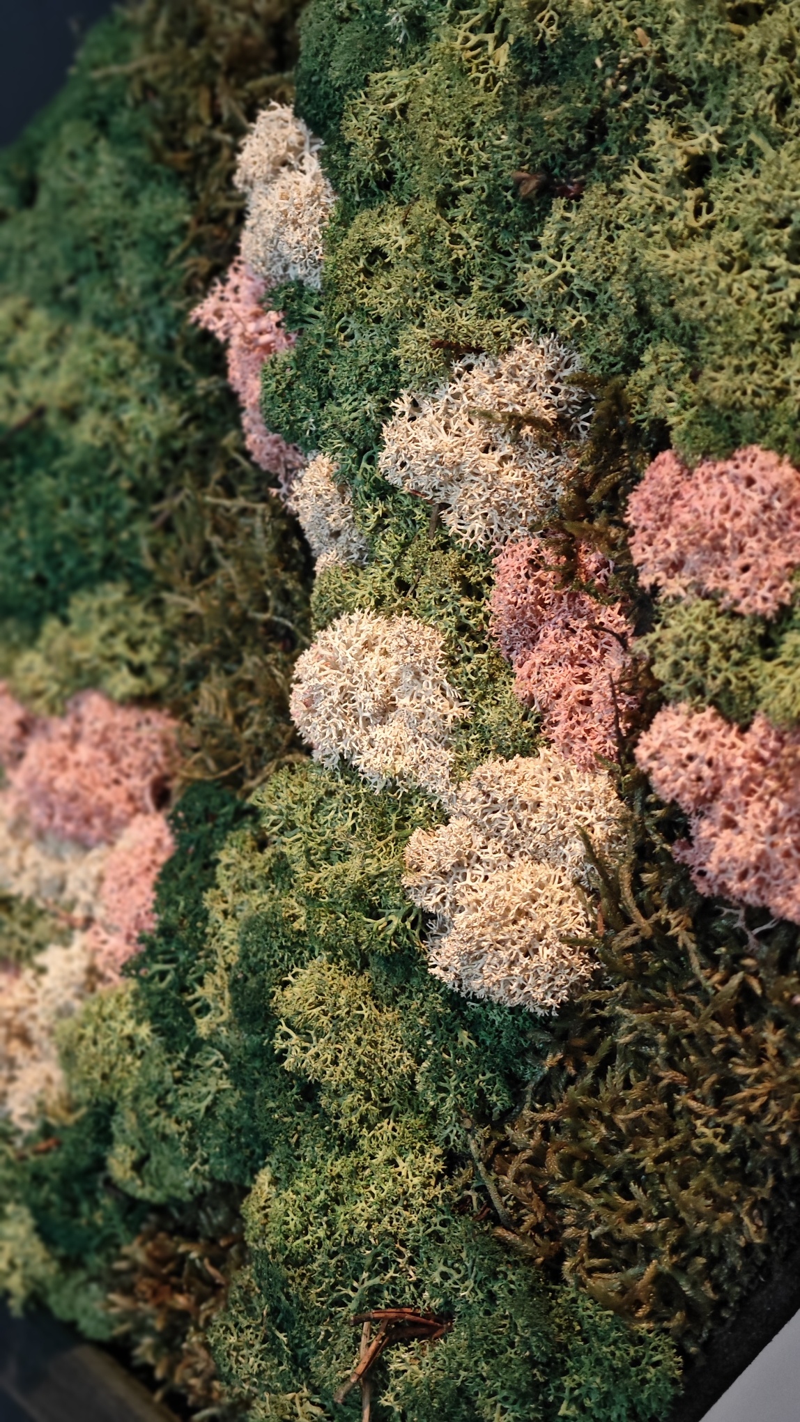 Moss artwork Milly is a moss artwork that brings nature into your home. This moss artwork features a light pink and white accent colour, which provide a beautiful contrast to the other deep green shades. The subtle colour combination creates a soothing yet vibrant look, ideal for brightening up any wall. The playful flecks of flat moss add texture and depth, making moss artwork Milly a real eye-catcher in any interior.