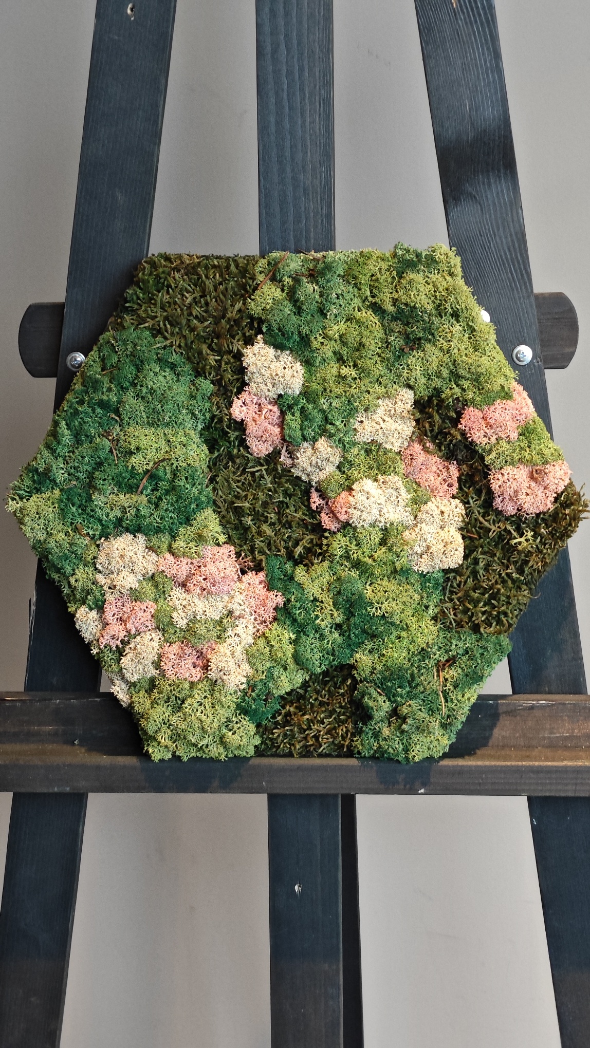 The image shows the pattern of a Hexagon in size 100 cm. As it is a natural product, every moss artwork is unique. As a result, the format of the moss artwork purchased may differ from the selected photo. Should you require a different size? Please contact us at [email protected].