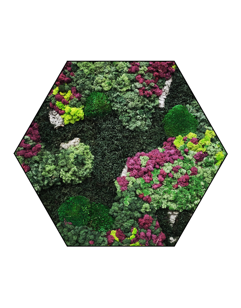 The image shows the pattern of a Hexagon in size 100 cm. As it is a natural product, each moss artwork is unique. As a result, the format of the moss artwork purchased may differ from the selected photo. Should you require a different size? Please contact us.