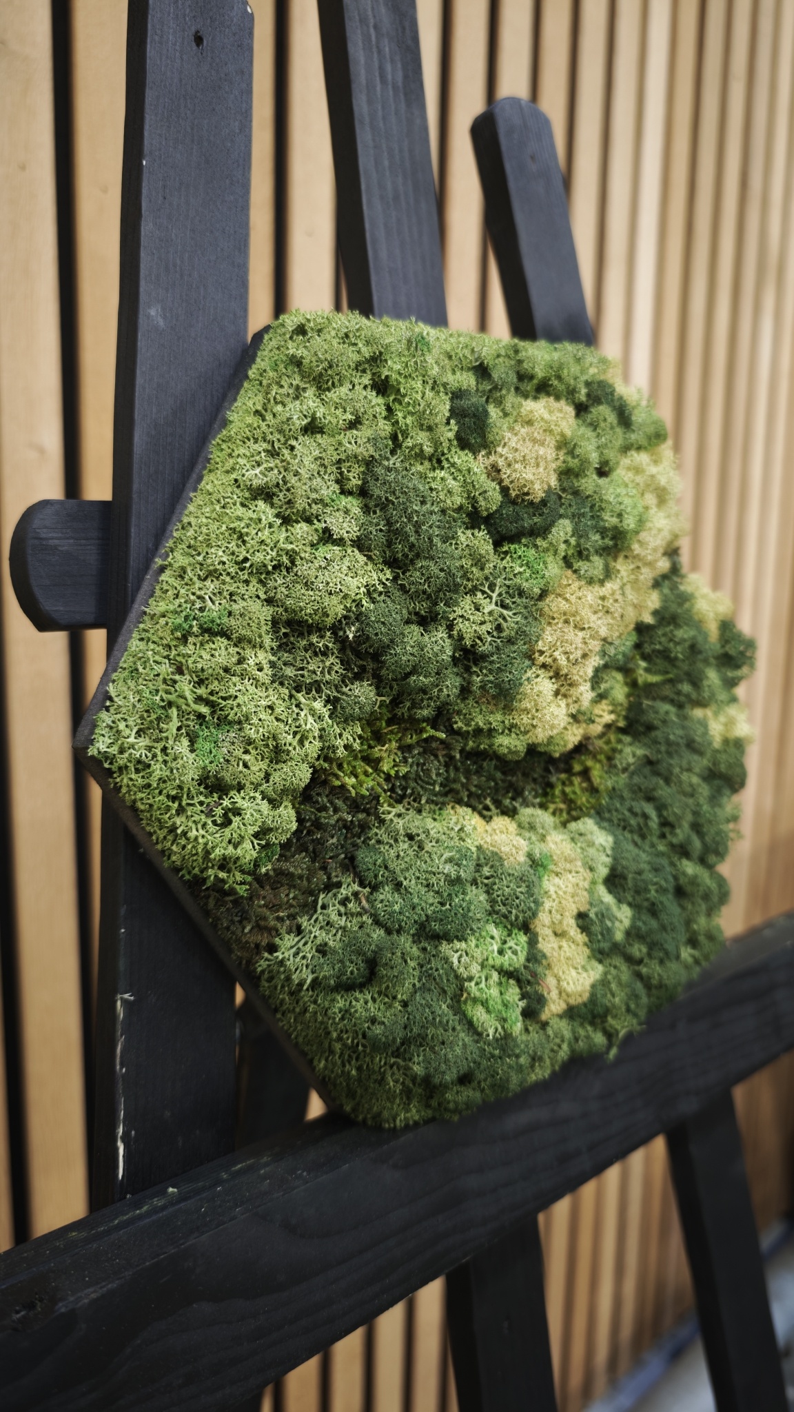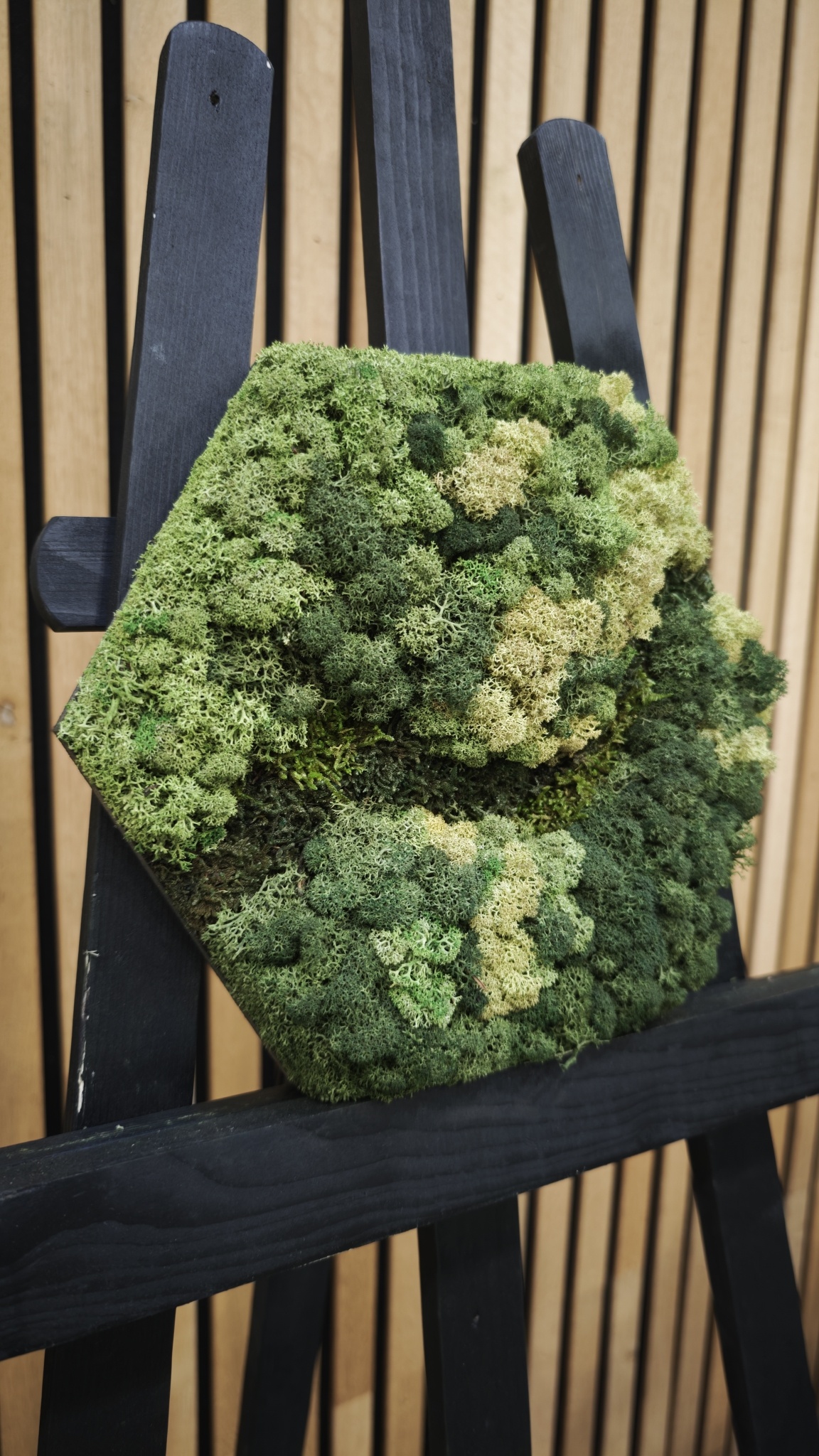 The image shows the pattern of a Hexagon in size 100 cm. As it is a natural product, each moss artwork is unique. As a result, the format of the moss artwork purchased may differ from the selected photo. Should you require a different size? Please contact us at [email protected].