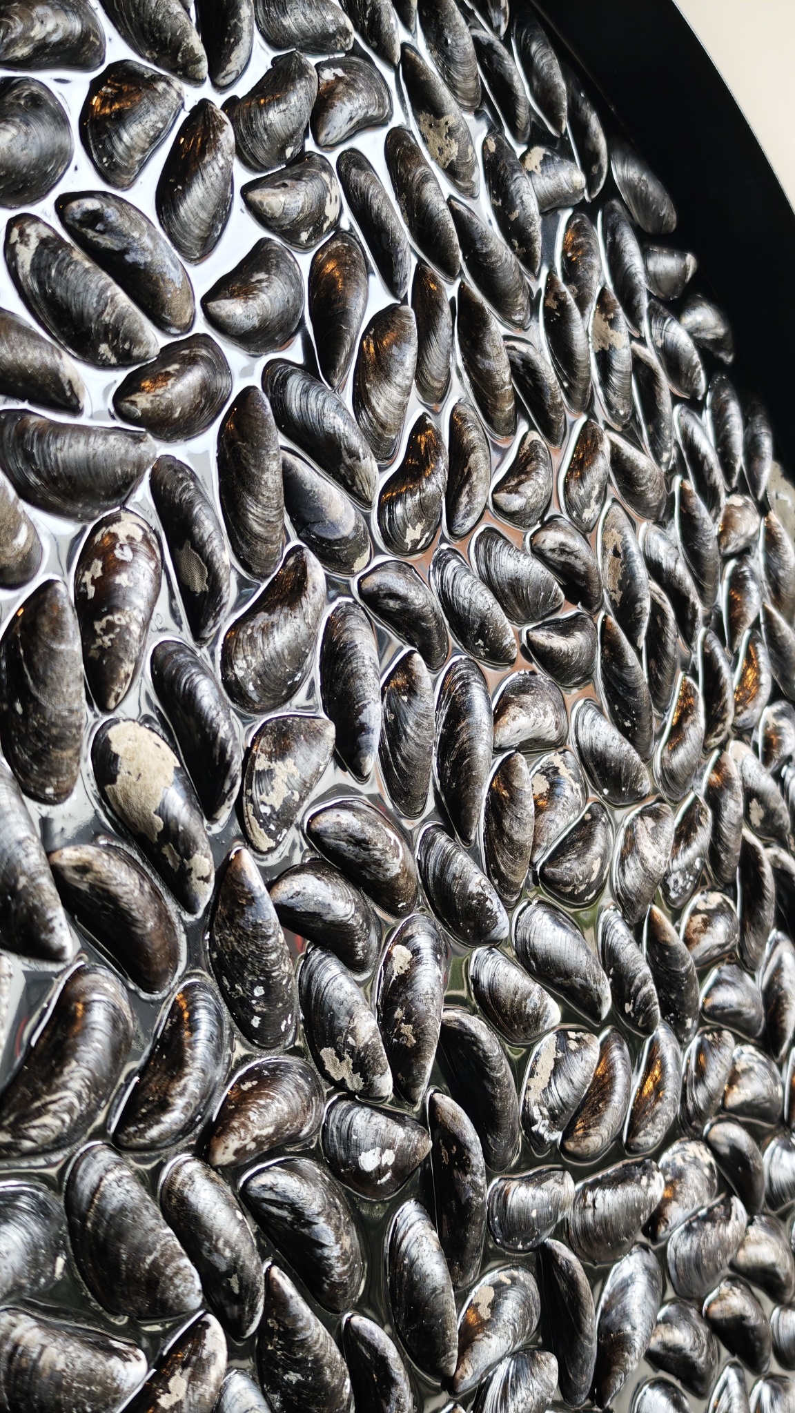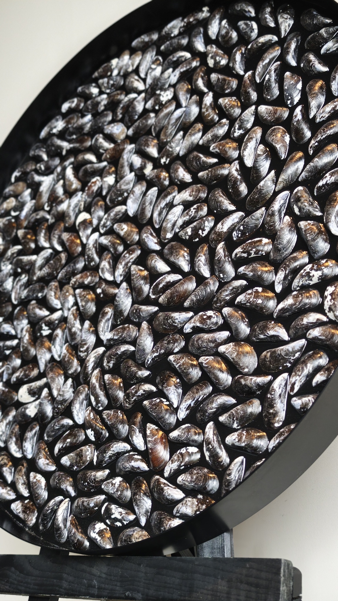 This mussel circle with a steel rim is a beautiful decorative piece that brings the natural beauty of the sea into your home. The circle is made up of real mussels, encased in a black/dark gray layer of epoxy, forming a lovely unified piece. The mussels are hand-selected, thoroughly washed, and hygienically processed. The powder-coated black steel rim in RAL 9005 gives the artwork a modern look, providing a nice contrast with the natural shapes of the mussels. This mussel circle is a true eye-catcher for nature and sea lovers.