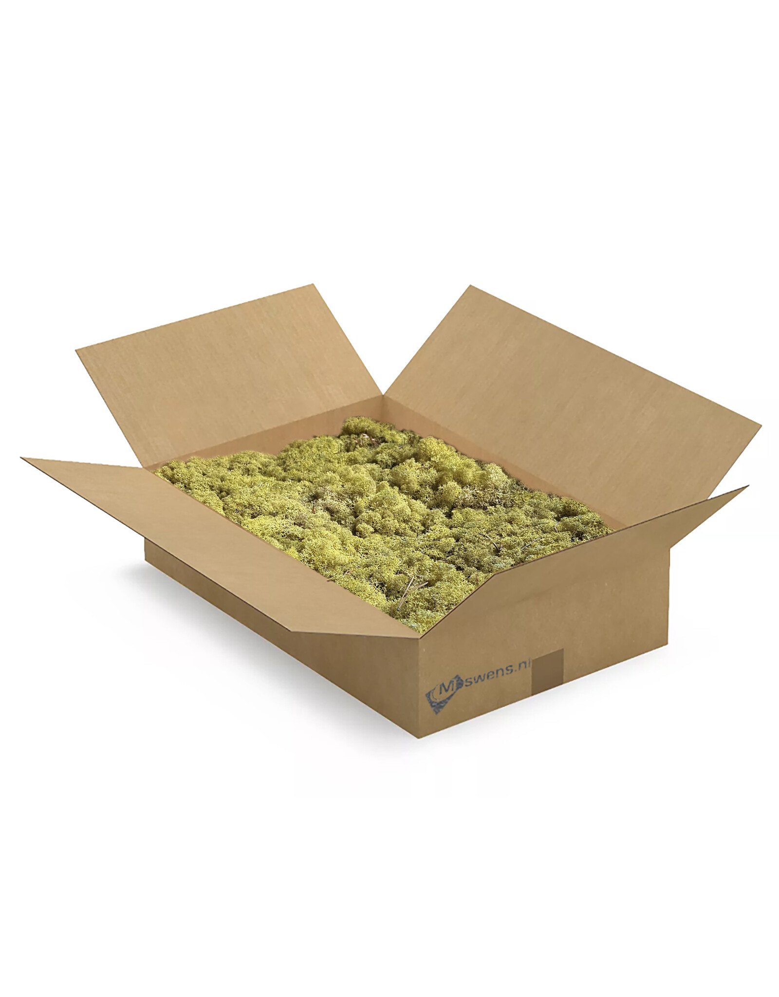 This 60x40x10 cm box contains reindeer moss. Good for making approximately 0.20-0.35 m². This depends on how 'solid' you want to process the moss and how 'fussy' you select and process the moss tufts provided.