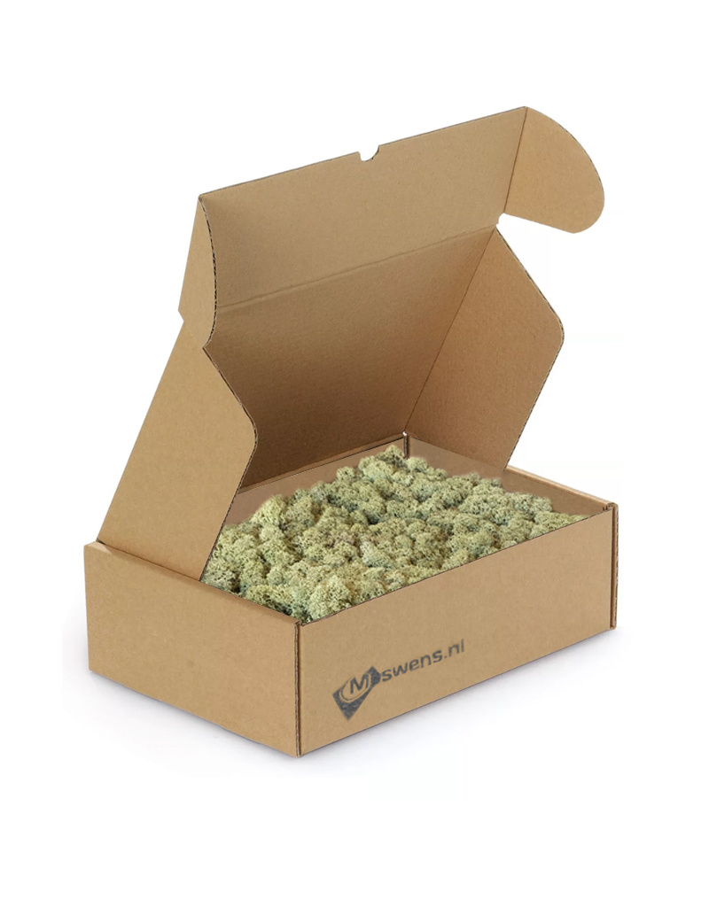 This 20x20x10 cm box contains reindeer moss. Good for making approximately 0.08 - 0.15 m². This depends on how 'solid' you want to process the moss and how 'fussy' you select and process the moss tufts supplied. This Medium pack is ideal if you want to mix moss colours together or for smaller surface areas.