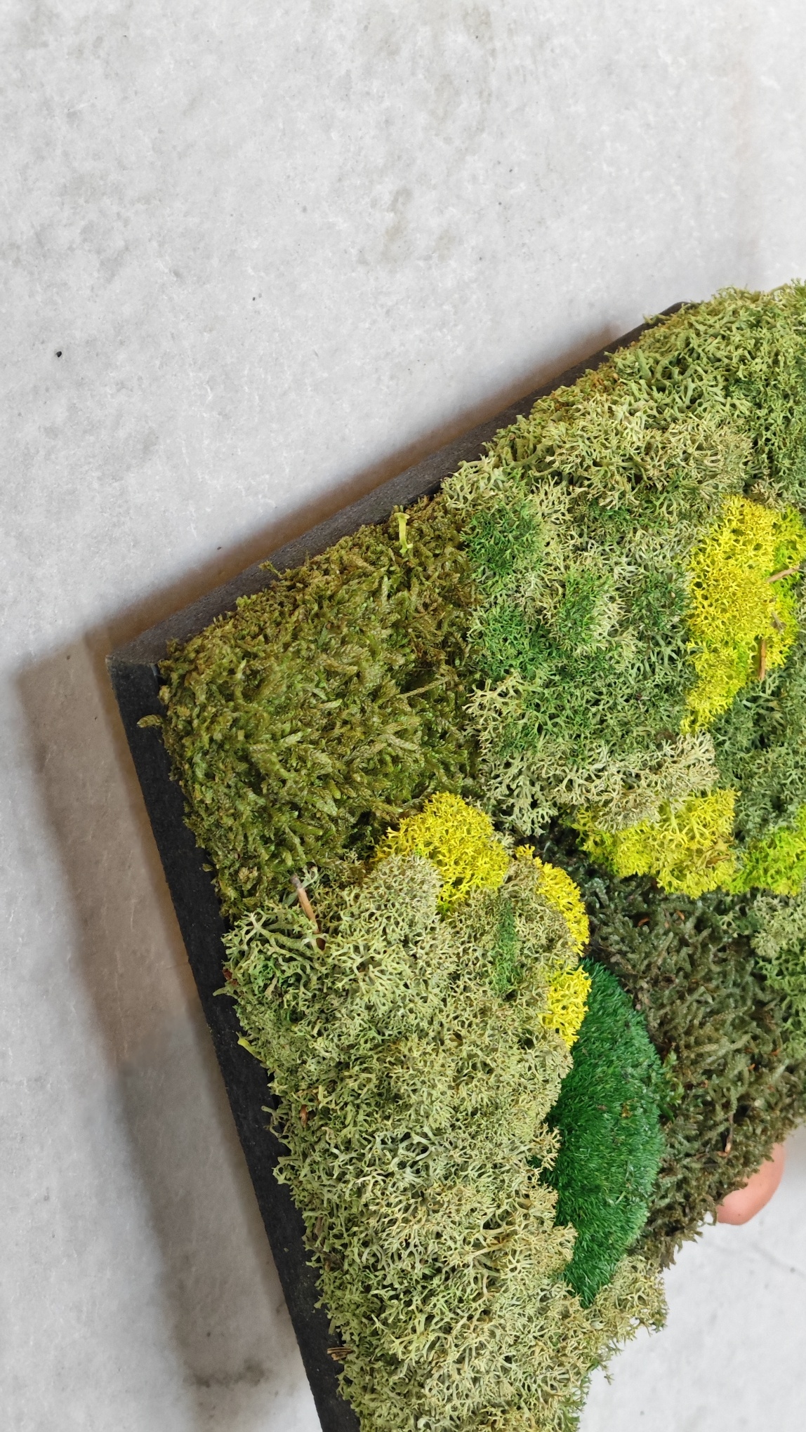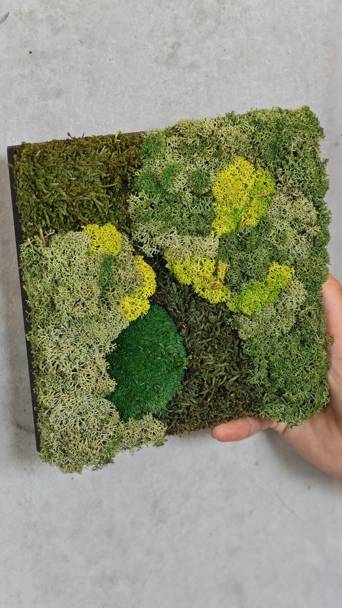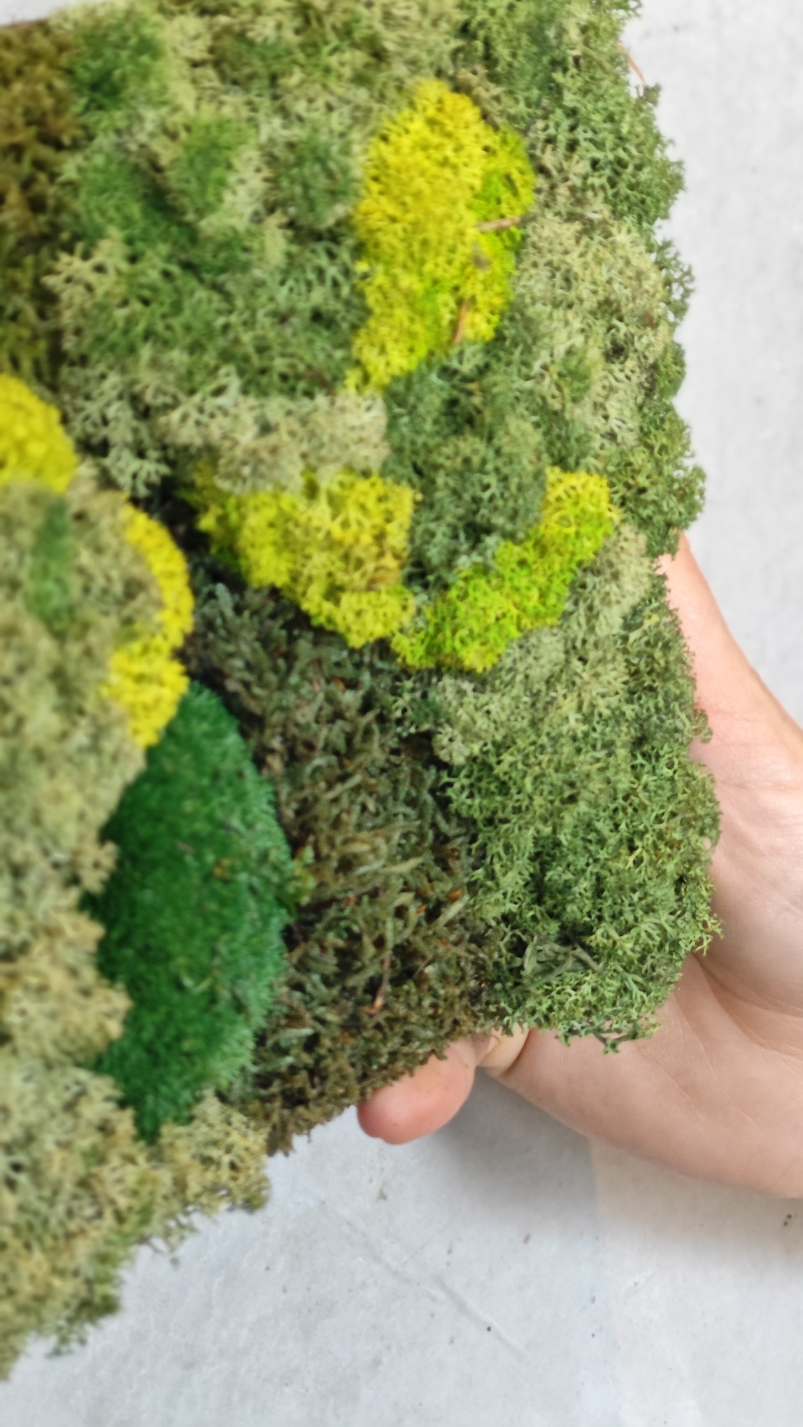 The moss is applied to a 17x17 cm wooden base, featuring a lovely mix of different moss types. This mix consists of flat moss, ball moss, and reindeer moss in the colours Apricis, Dimidium, and Forest. The pattern and dimensions may vary from the photo.