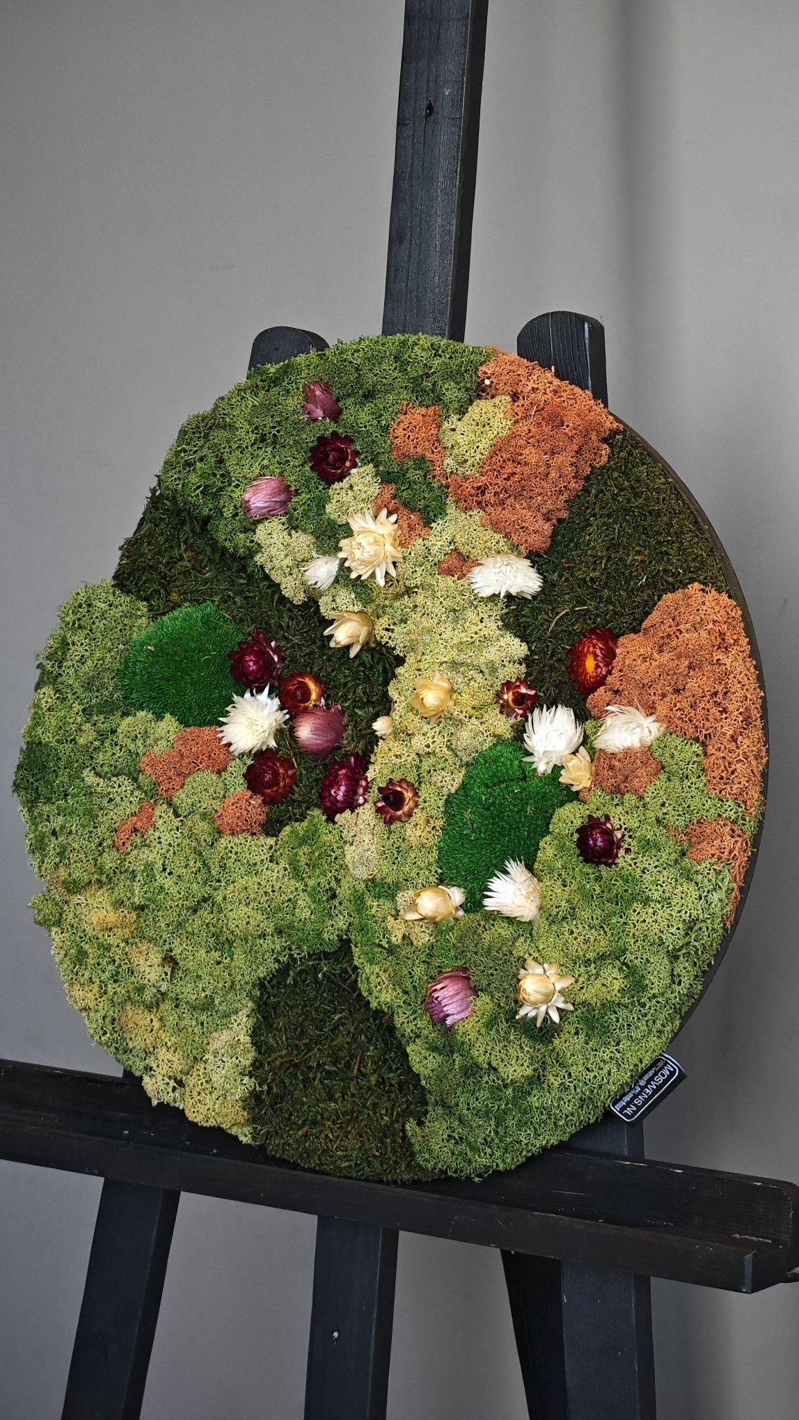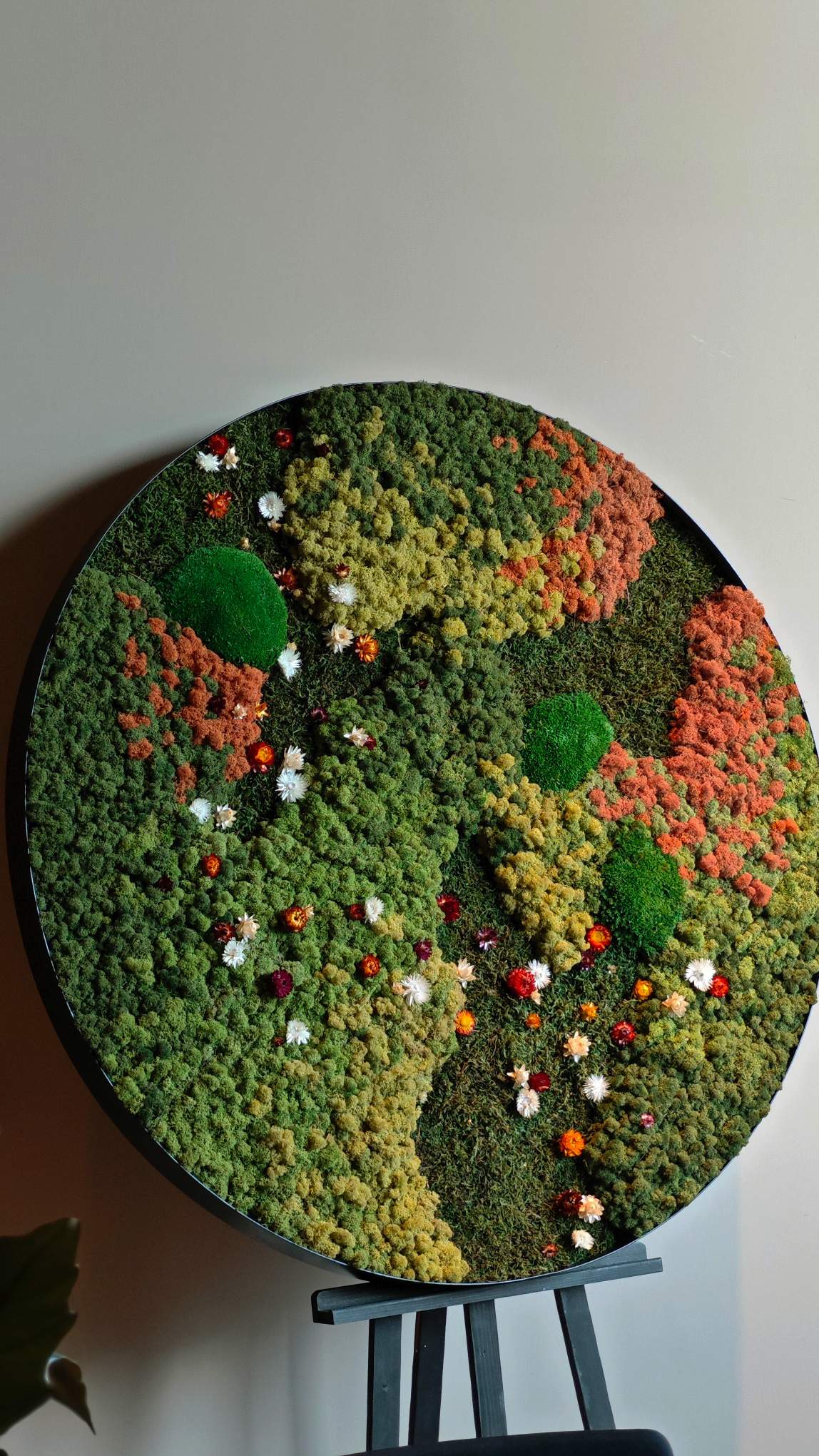 In mosschilderij Avalon zitten diverse mossoorten gecombineerd met vrolijke, gekleurde droogbloemen in het wit, oranje en donkkerrood. Perfect voor wie zijn interieur een frisse en vriendelijke touch wil geven. Maak met dit mosschilderij een statement en voeg iets unieks toe aan uw muur.