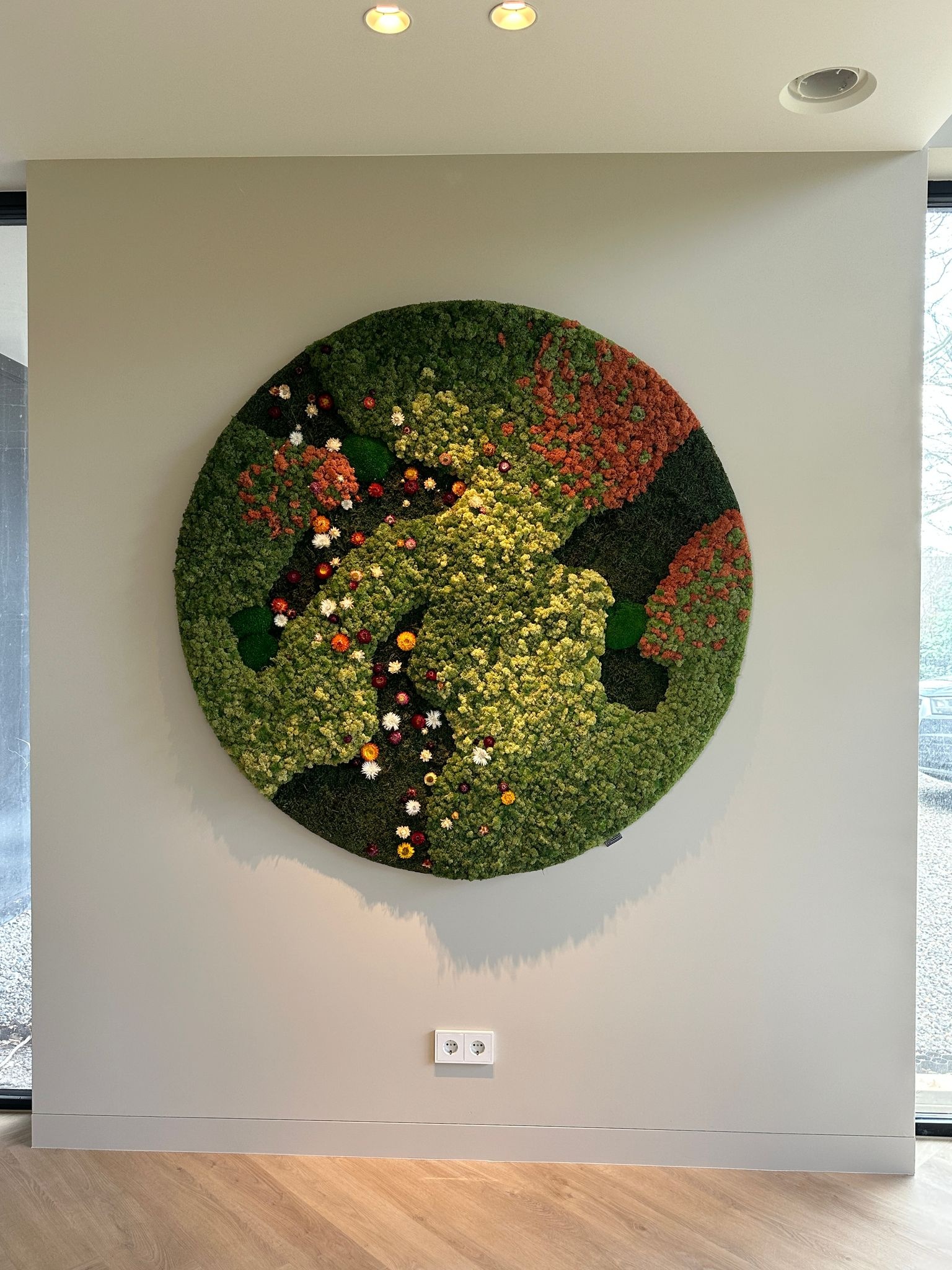 Op de afbeelding is het patroon zichtbaar van een moscirkel diameter 1.00. Aangezien het een natuurproduct is, is ieder mosschilderij uniek. Hierdoor kan de opmaak van de aangeschafte moscirkel afwijken van de geselecteerde foto. Mocht u een andere maat wensen? Neem contact met ons op via [email protected]