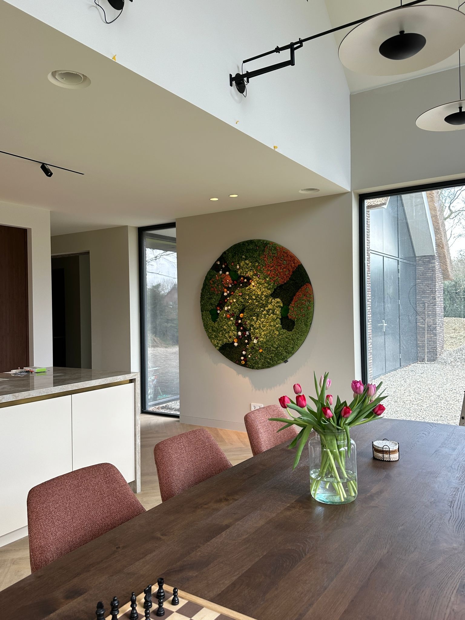 De moscirkels zorgen voor een unieke groene sfeer, wat uitermate geschikt is om toe te passen in (leef)keukens/ontvangstruimtes/kantoorruimtes/verblijfsruimtes of boven de bank bij u thuis.