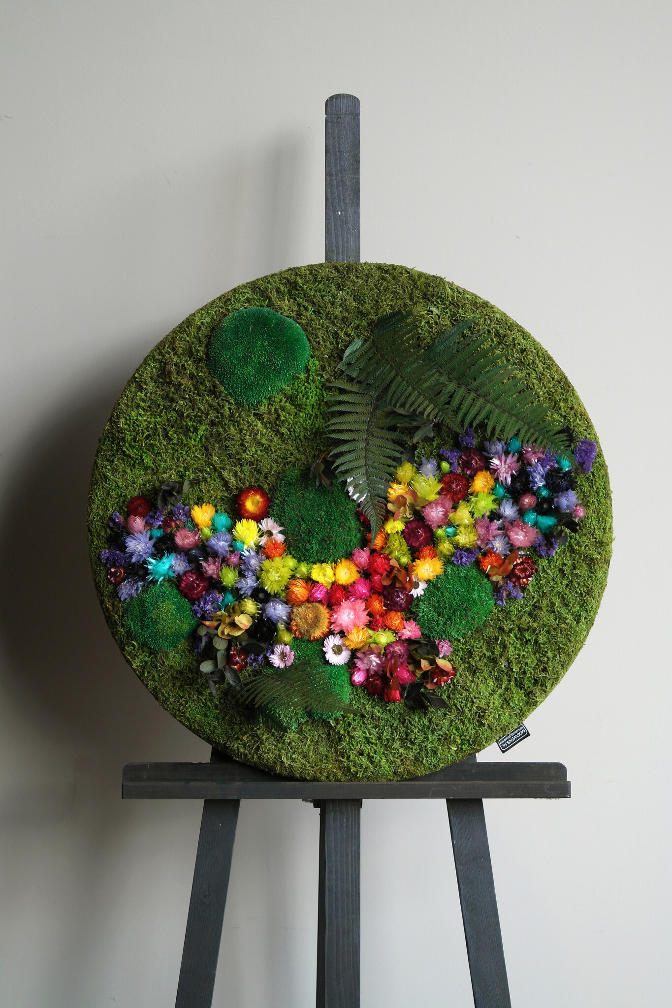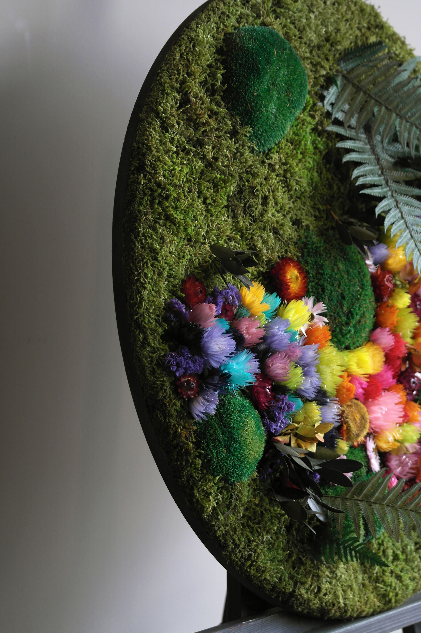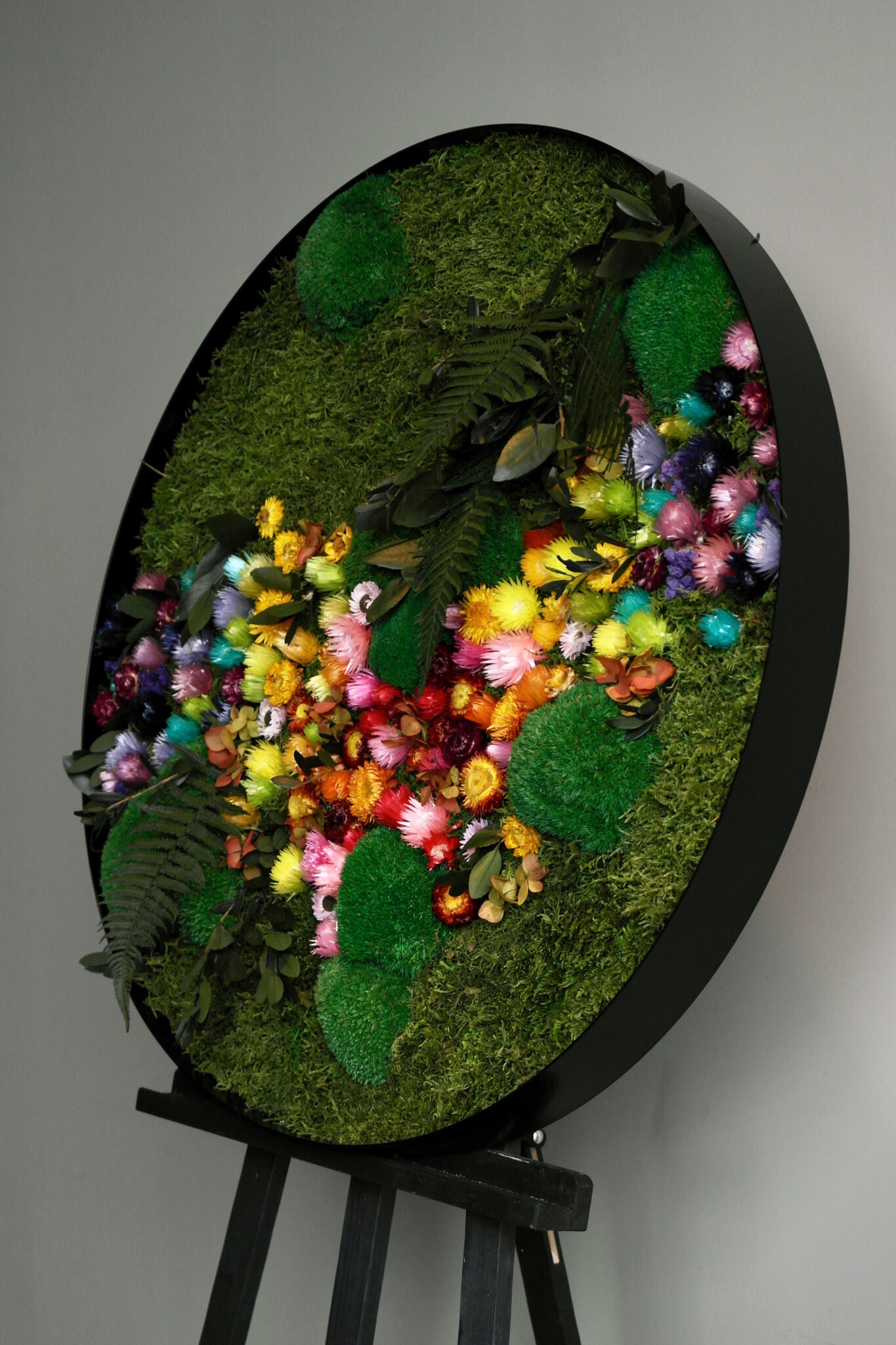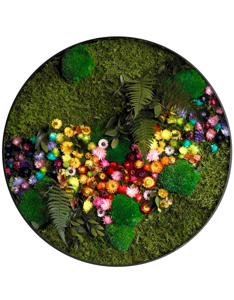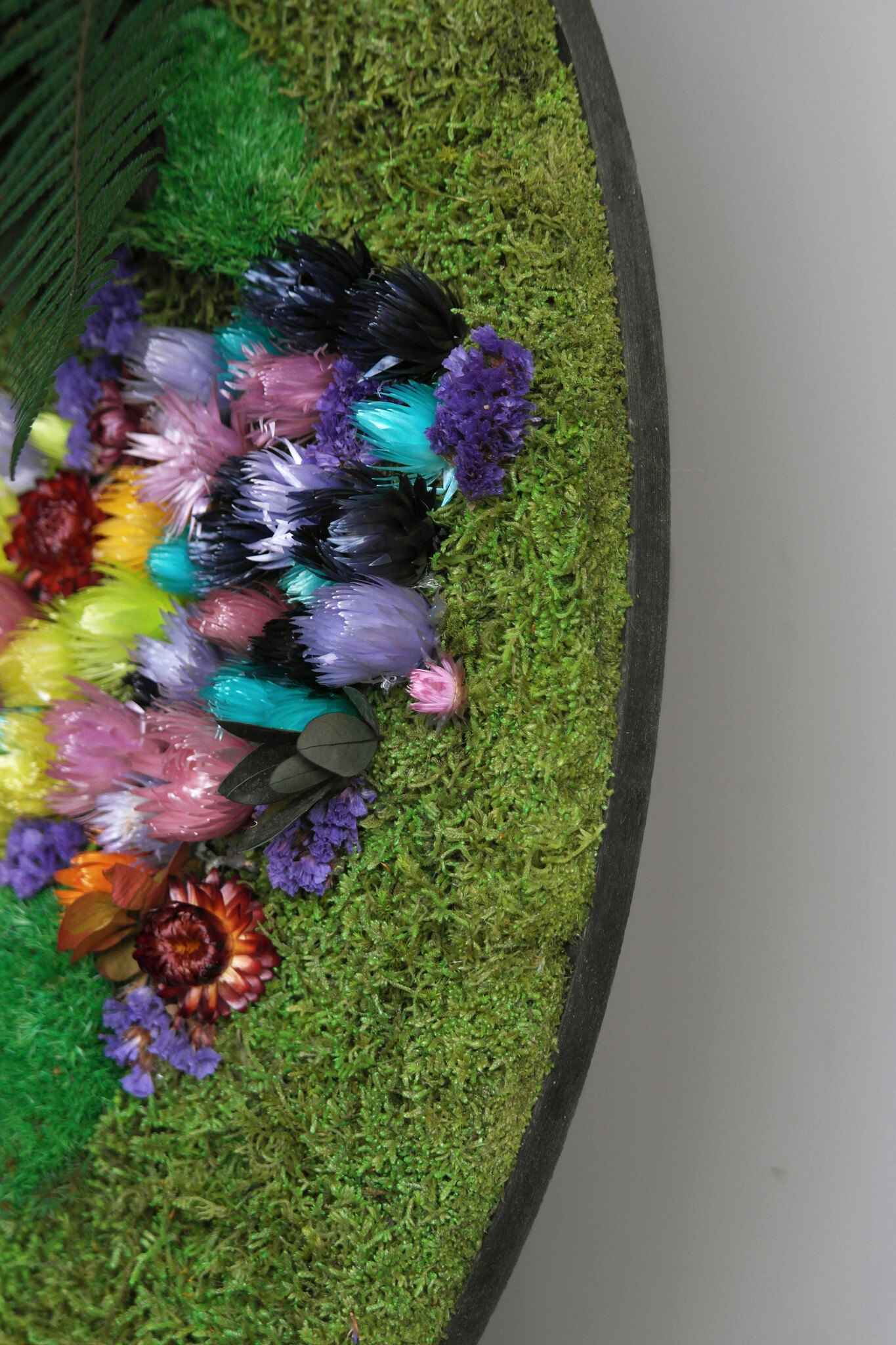 Mosschilderij Liva is een mosschilderij dat is samengesteld uit een basis van platmos en bolmos, aangevuld met jungle bladeren. Daarnaast bevat dit mosschilderij een sierlijke lijn van droogbloemen in levendige regenboogkleuren, die het geheel een speelse en sierlijke uitstraling geven. Dit mosschilderij combineert de natuurlijke rust van het mos met de kleurrijke vrolijkheid van bloemen en is bovendien volledig onderhoudsvrij.