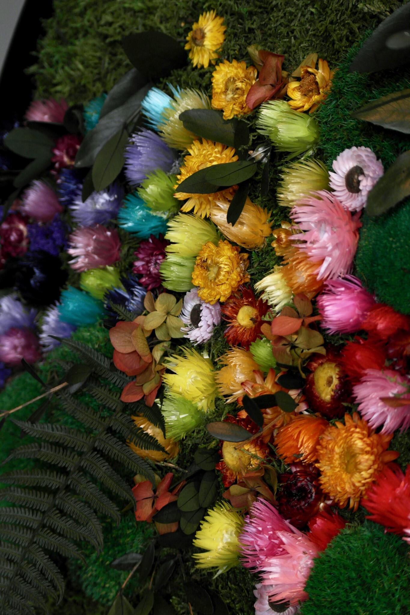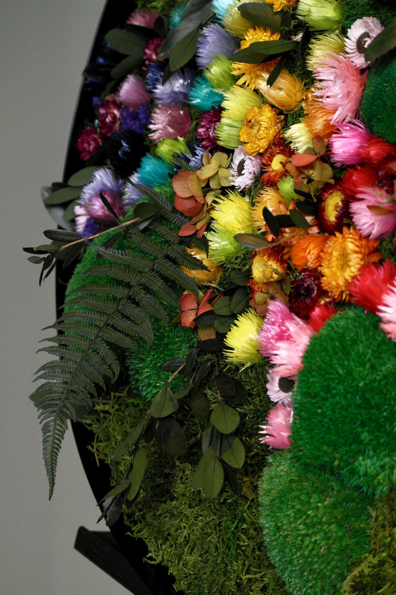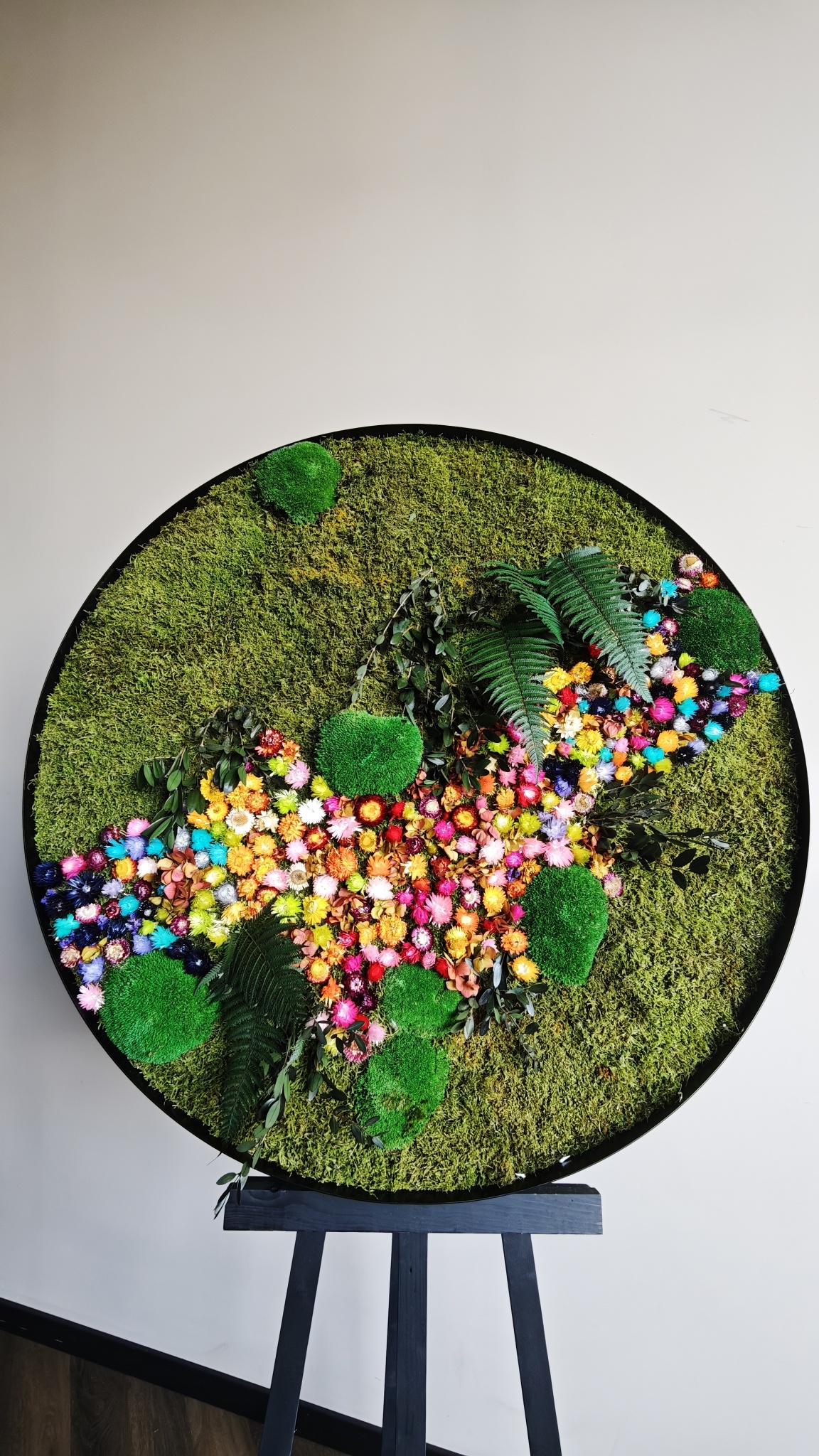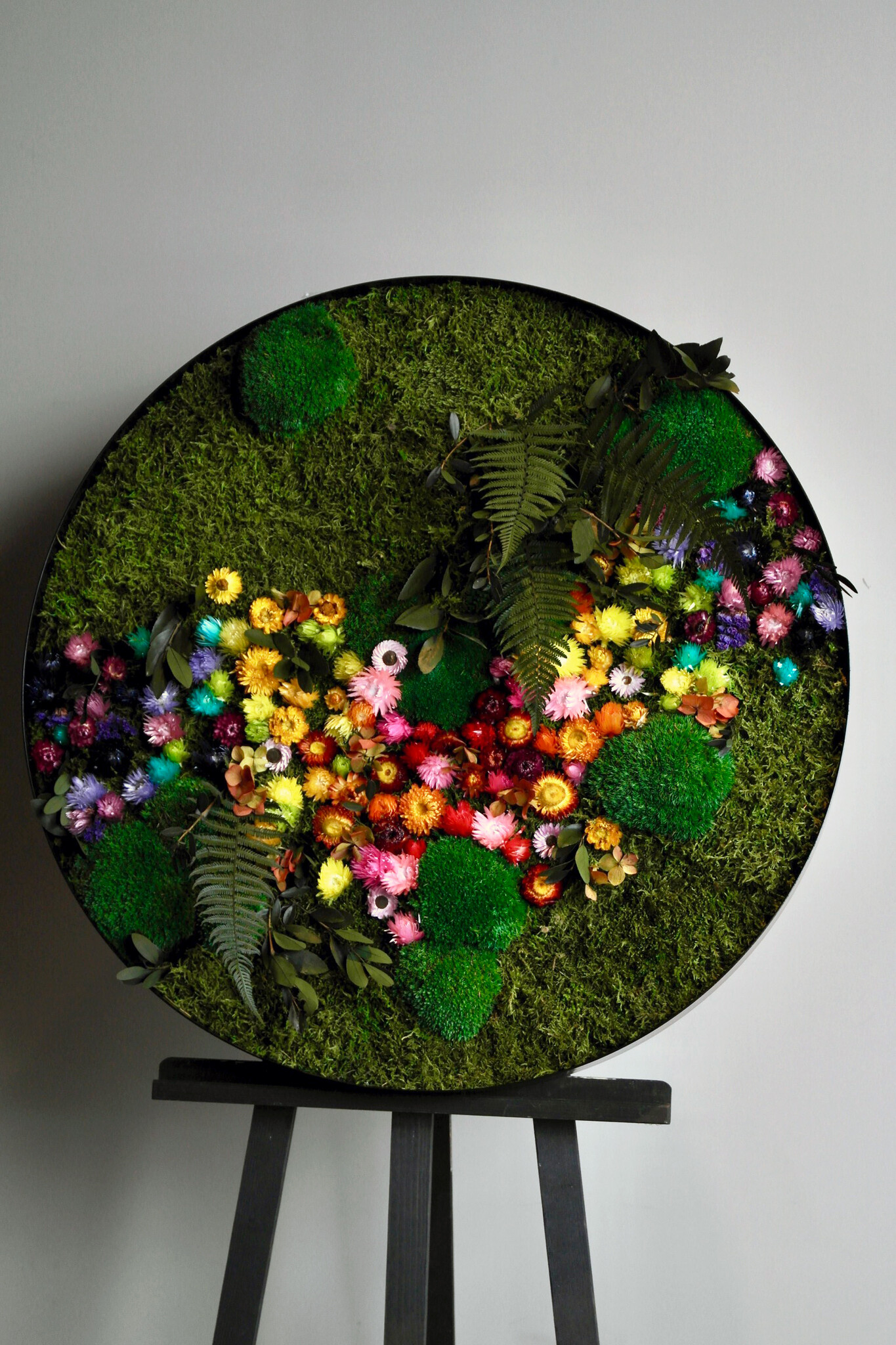 Mosschilderij Liva is een mosschilderij dat is samengesteld uit een basis van platmos en bolmos, aangevuld met jungle bladeren. Daarnaast bevat dit mosschilderij een sierlijke lijn van droogbloemen in levendige regenboogkleuren, die het geheel een speelse en sierlijke uitstraling geven. Dit mosschilderij combineert de natuurlijke rust van het mos met de kleurrijke vrolijkheid van bloemen en is bovendien volledig onderhoudsvrij.