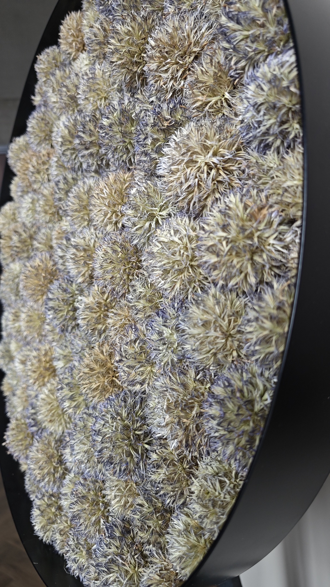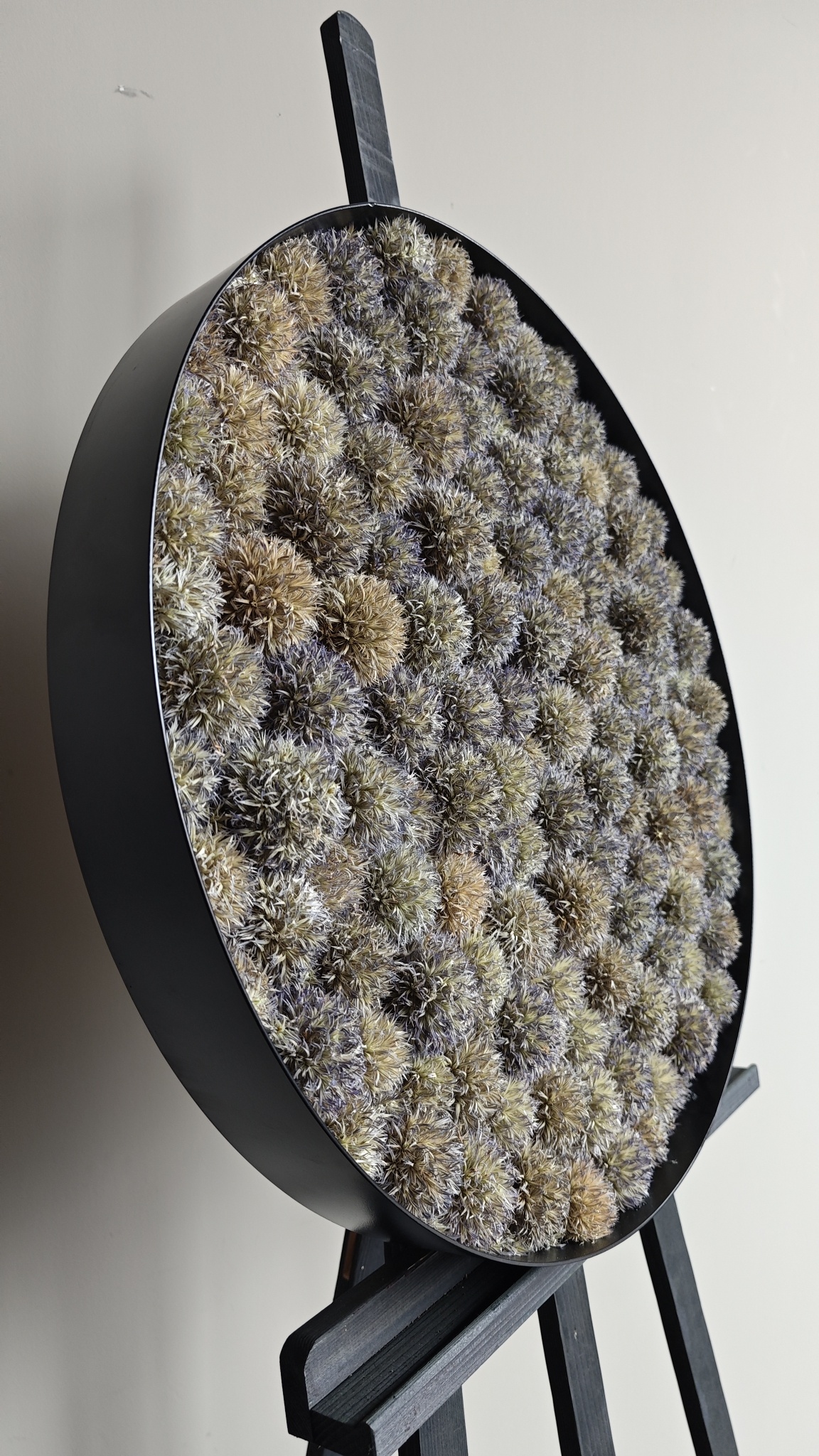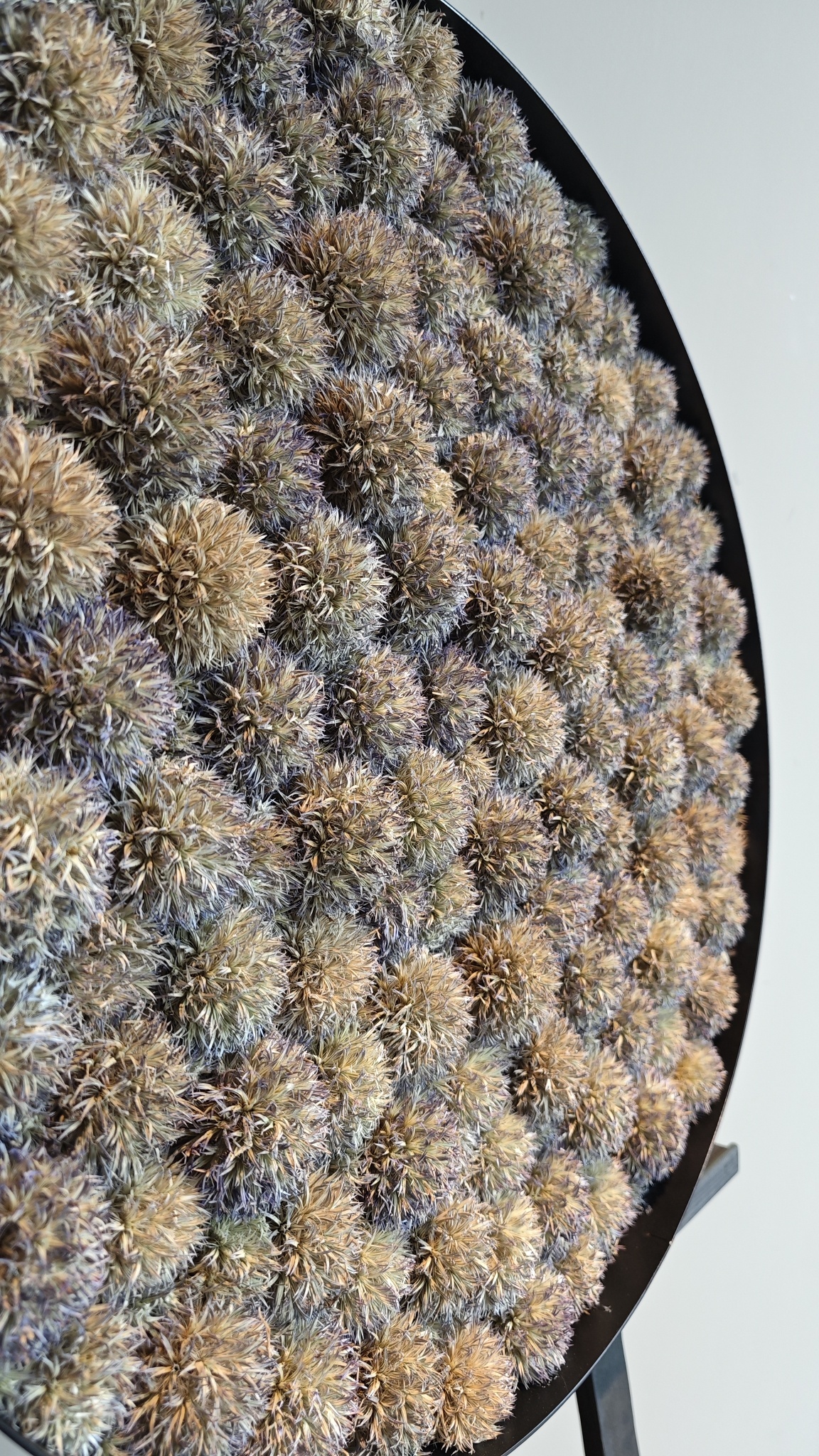 De echinops cirkel op de foto heeft een diameter van 60 cm en weegt +/- 5 kg. Het schilderij is opgebouwd uit een houten onderplaat, omringd door een hoogwaardige, gepoedercoate zwarte stalen rand.