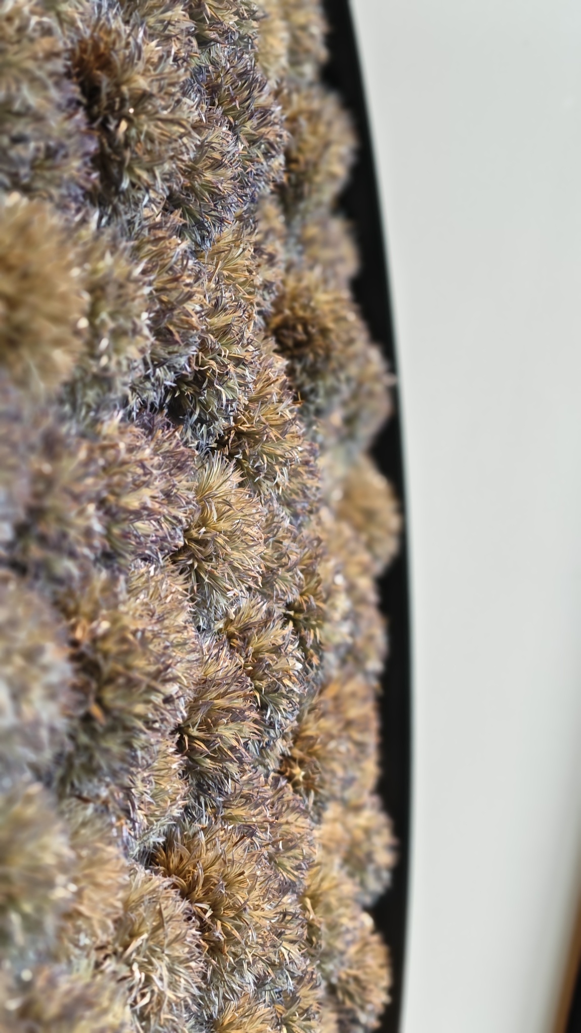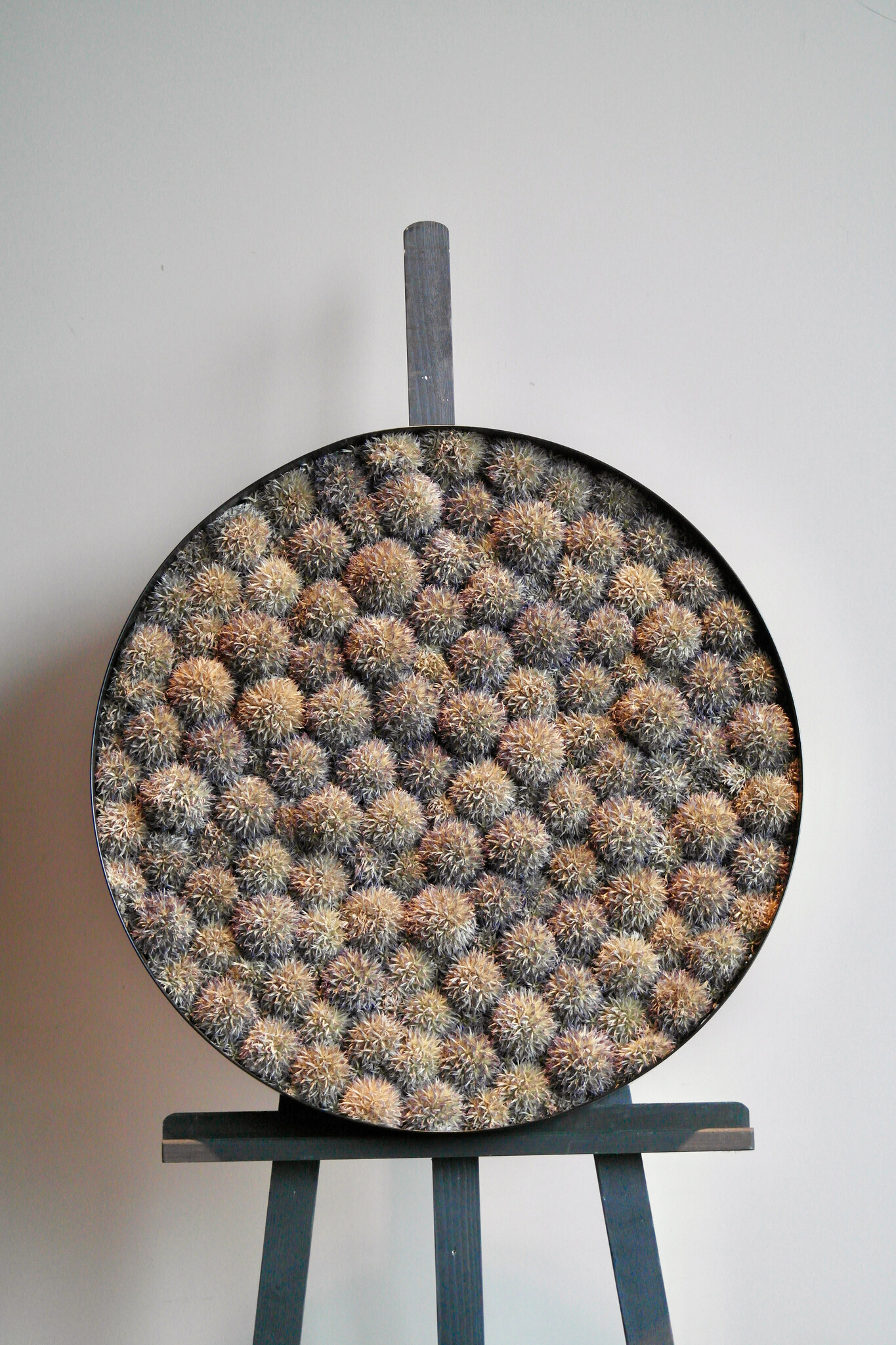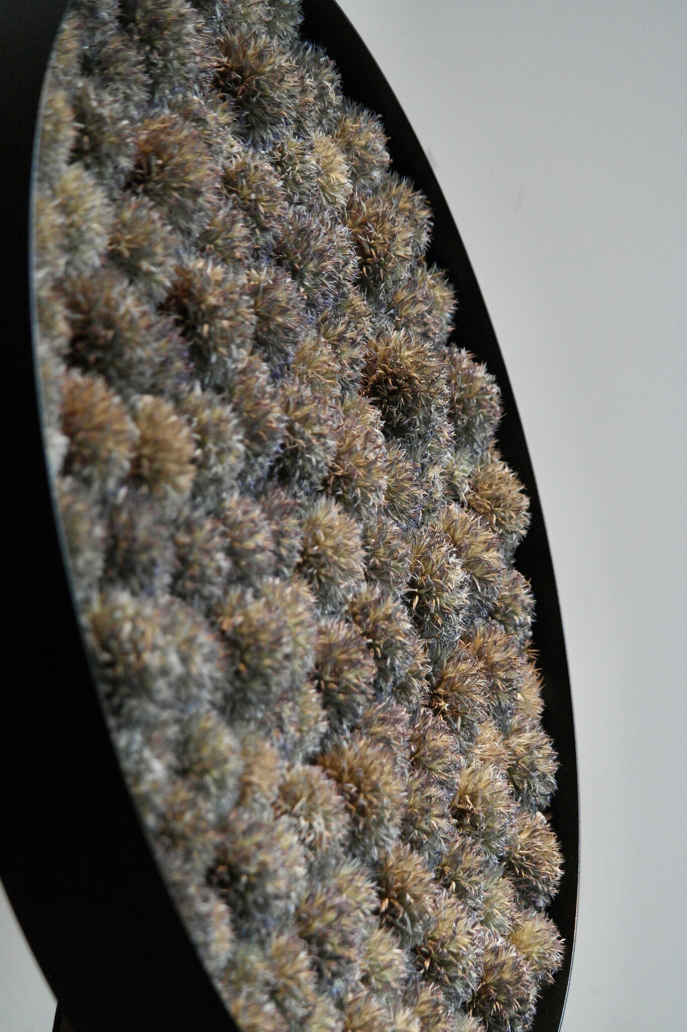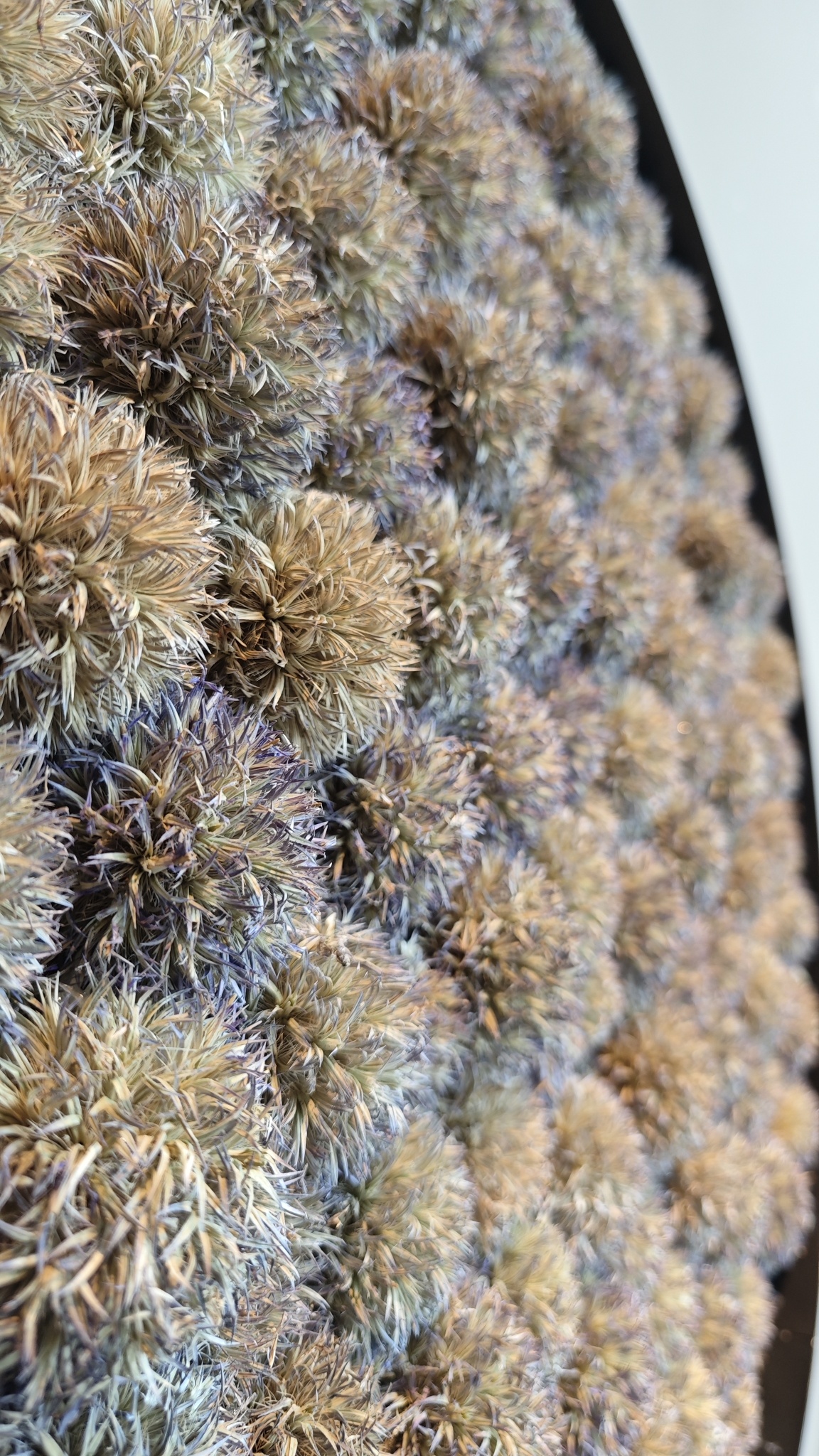 De echinops cirkel op de foto heeft een diameter van 60 cm en weegt +/- 5 kg. Het schilderij is opgebouwd uit een houten onderplaat, omringd door een hoogwaardige, gepoedercoate zwarte stalen rand.