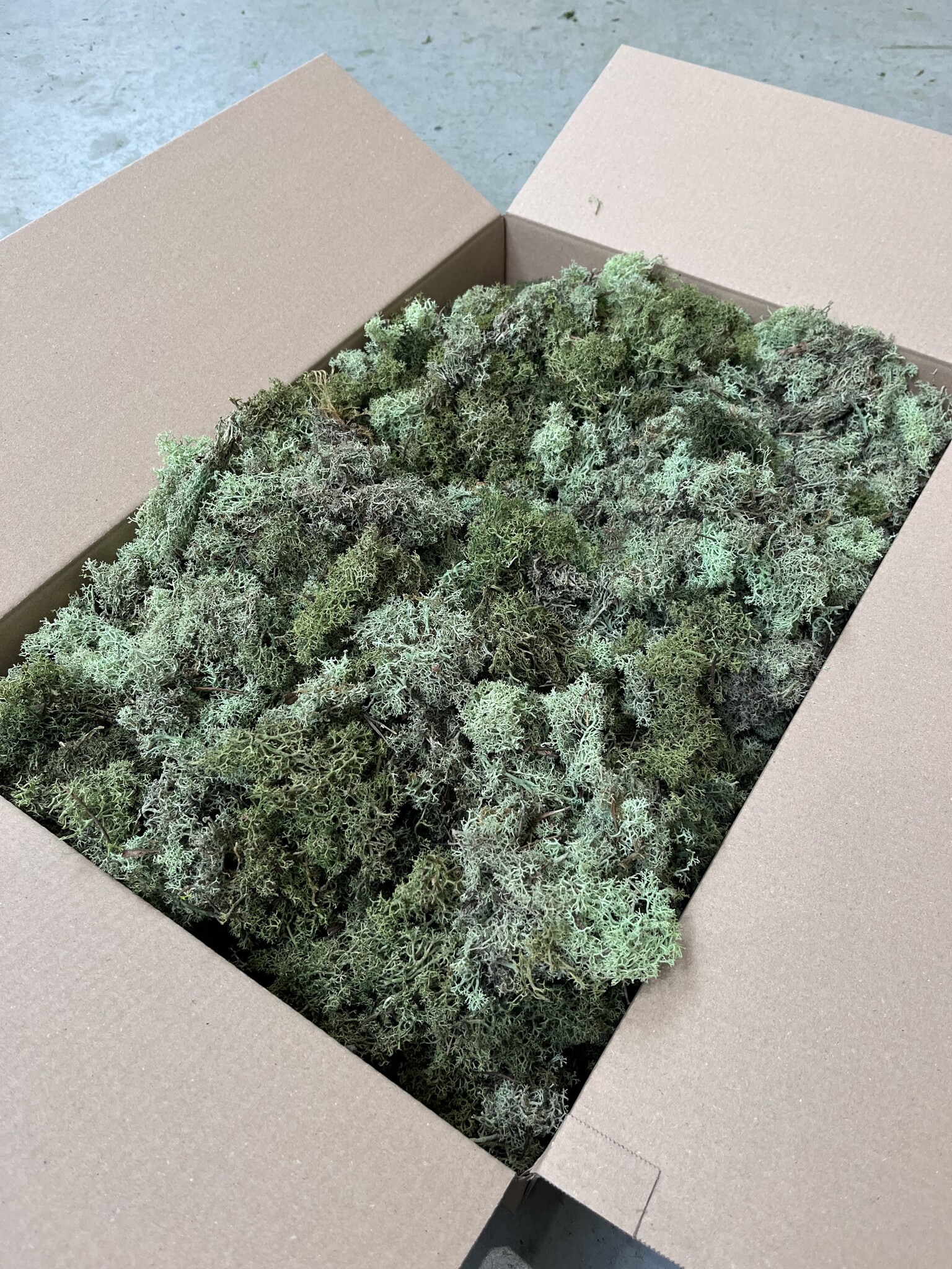 In deze L doos van 60x40x10 cm zit ECO mos. Goed voor het maken van 0.20-0.35 m². Dit is afhankelijk van hoe 'vast' u het mos wilt verwerken en hoe 'kieskeurig' u het geleverde mos selecteert en verwerkt. Tijdens het gebruik van dit volledige mos komen er kleurschakeringen terug. In de ECO dozen zitten minder 'mos kopjes' dan in de Rendiermos dozen. Wilt u een strakke moswand, kies dan voor de normale rendiermos dozen. Mag de wand een wildere uitstraling krijgen en bent u prijsbewust dan zijn onze ECO L dozen geschikt voor uw project. U kunt ook kiezen voor een mix waarin verschillende tinten met elkaar gemixt zijn voor een speelser en variërend effect.